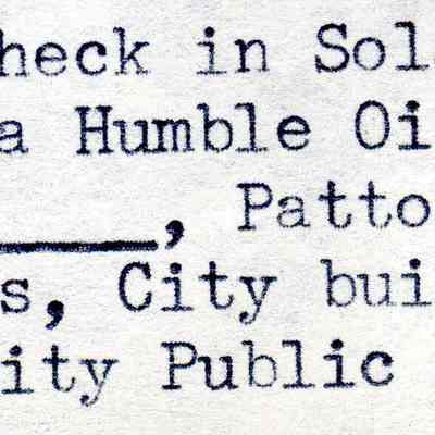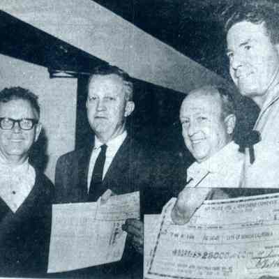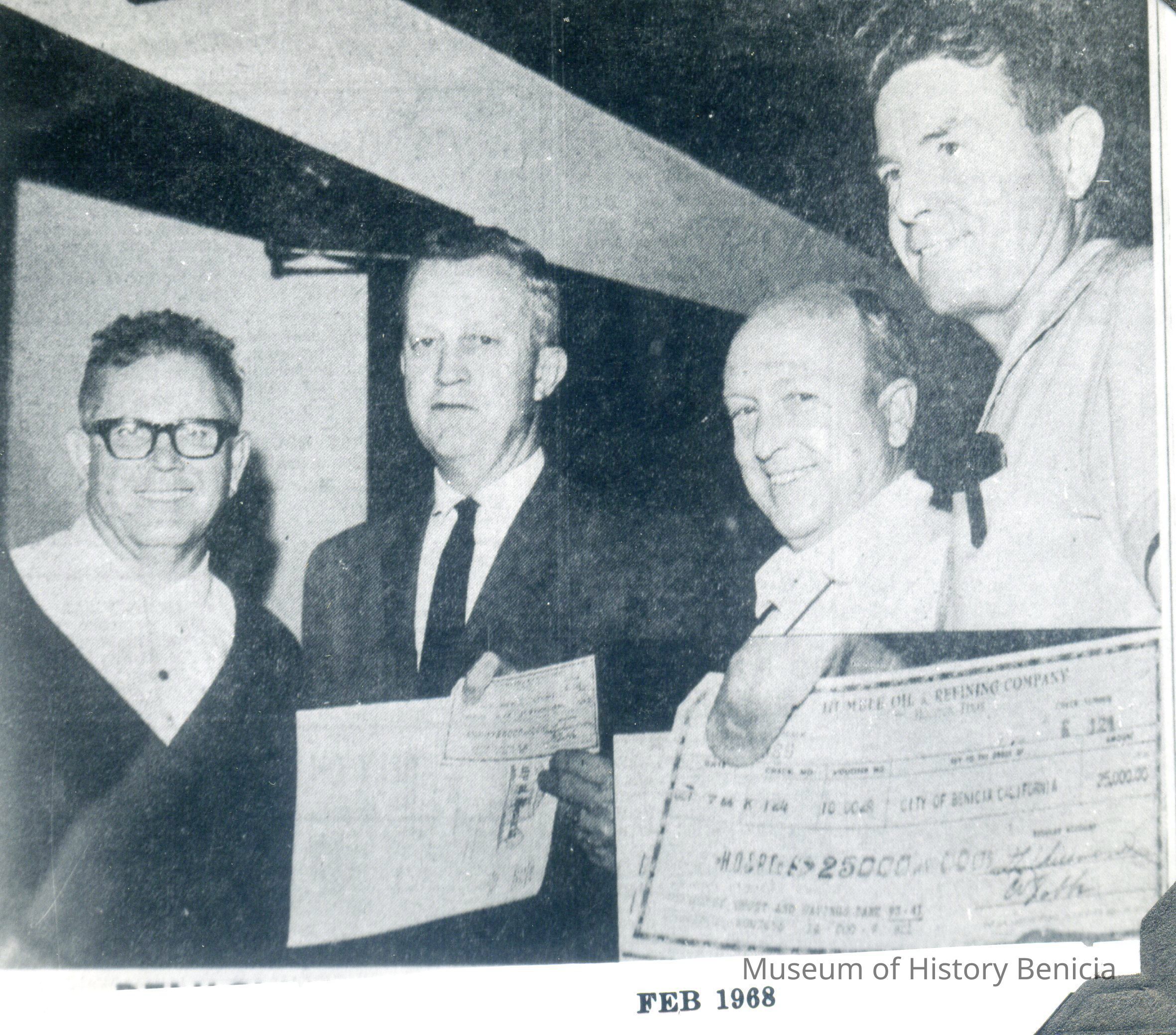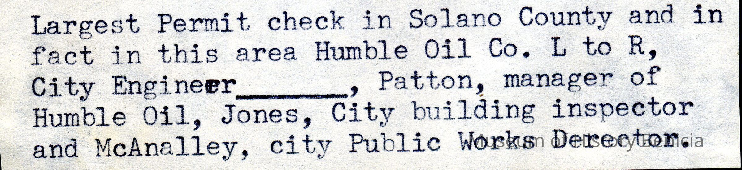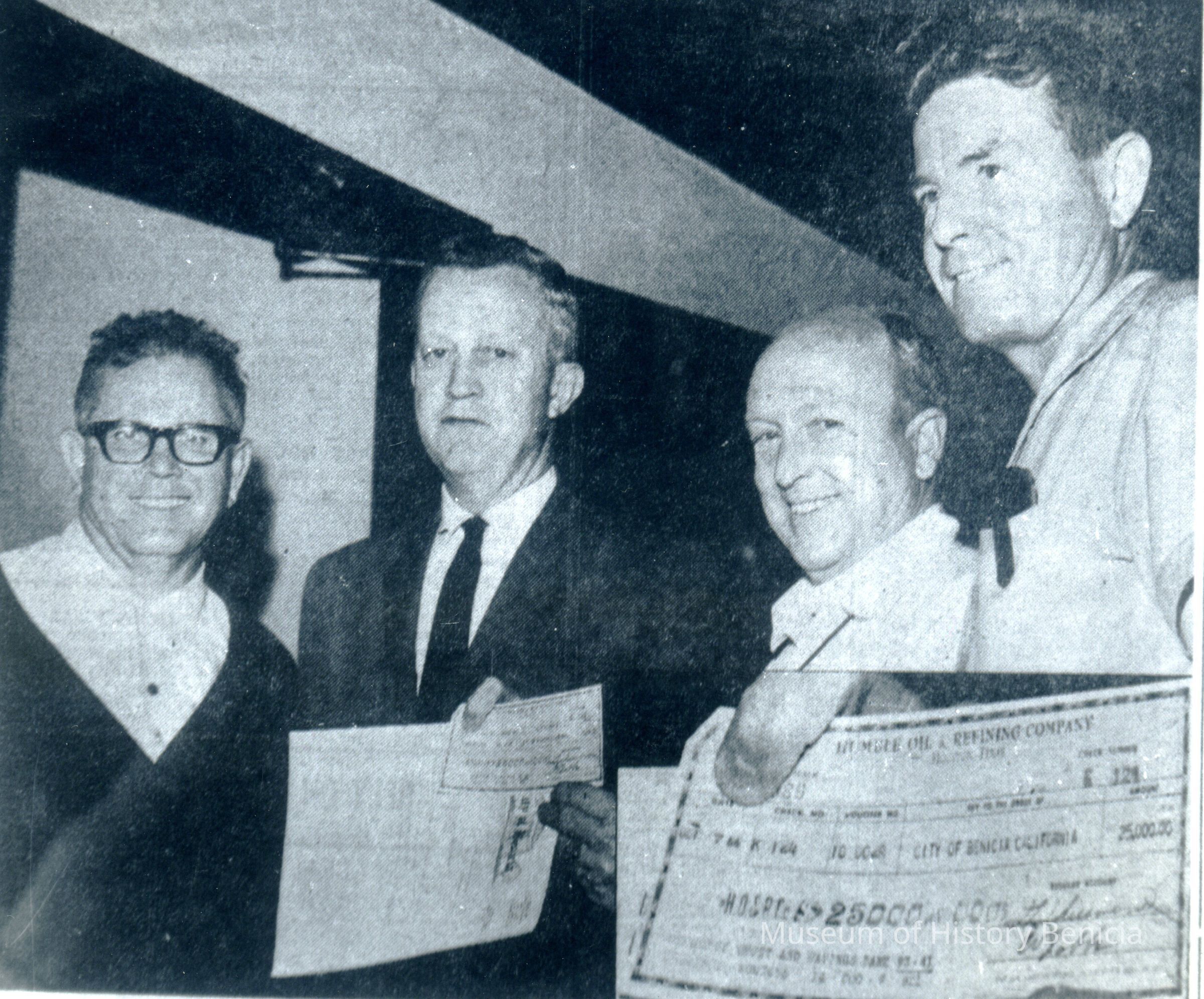 B/W photograph of Largest Permit Check in Solano County (pictured: city engineer, Patton, manager of Humble Oil, Jones, city building inspector and McAnalley, city public works director)Collection