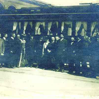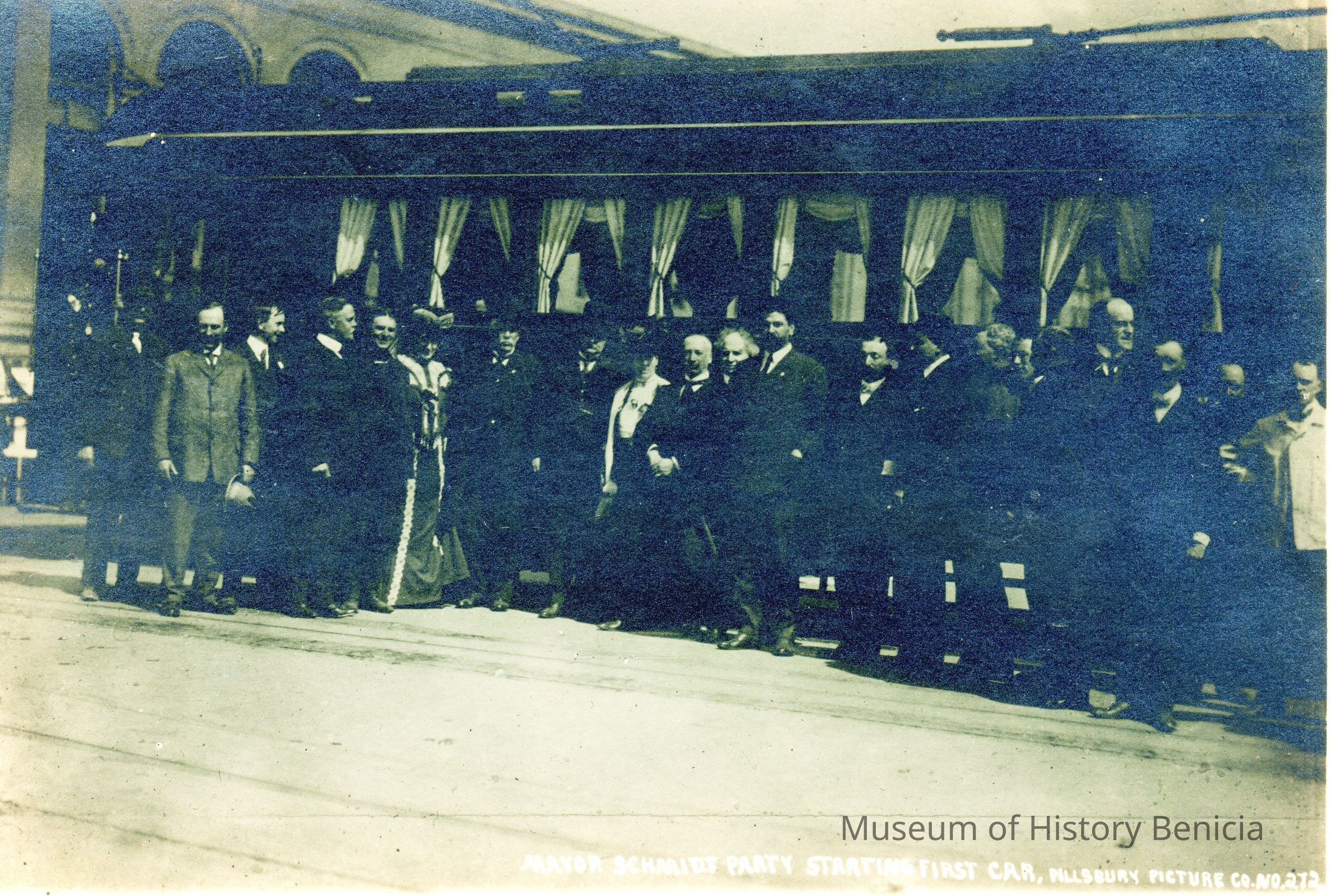 This photo is of Mayor Schmidt starting first (street) car after the SF earthquake of 1906. Written on the bottom is "Ferry Bldg".Collection