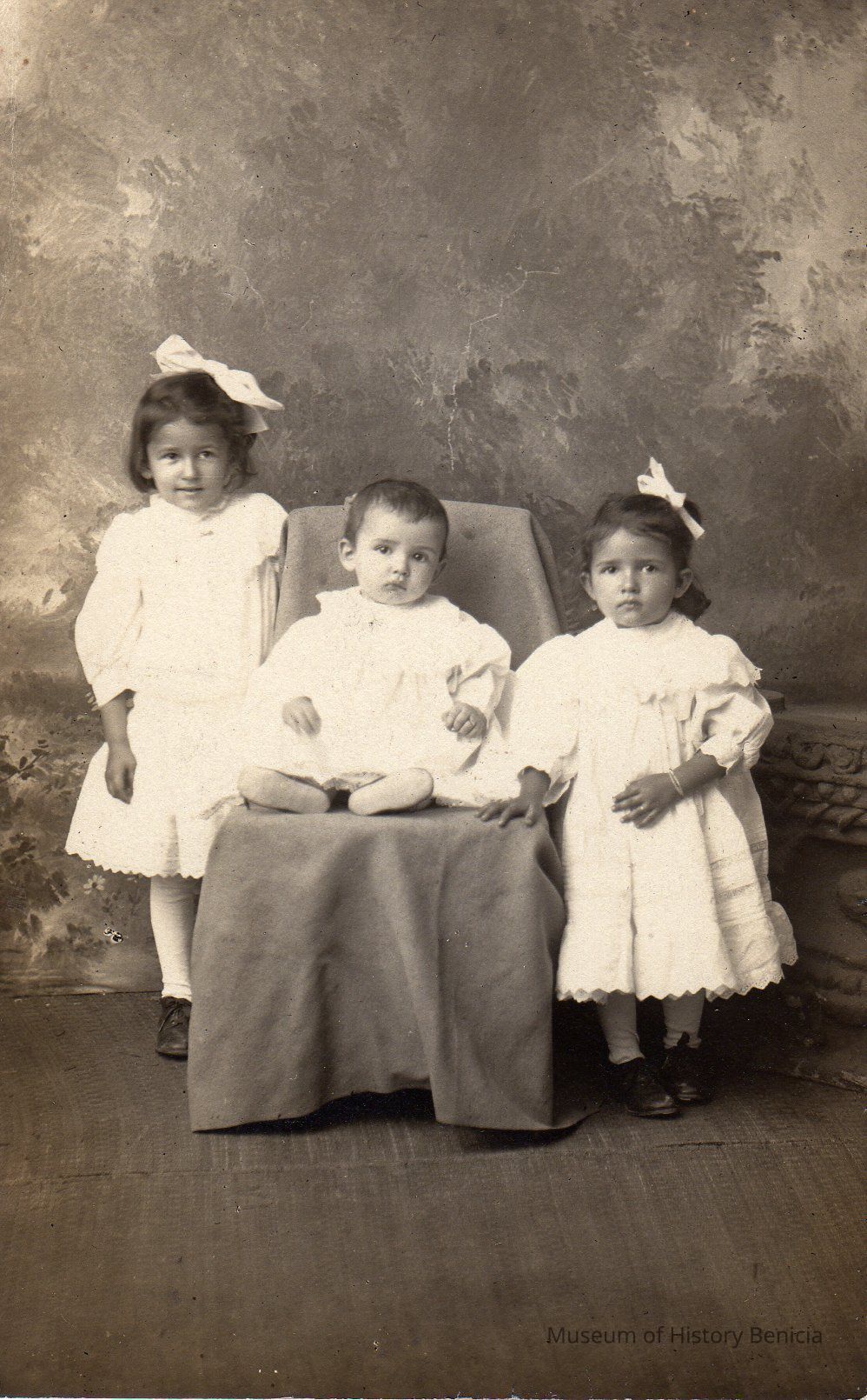 A little baby in a chair with two little girls, one on each side. B/W photo.
