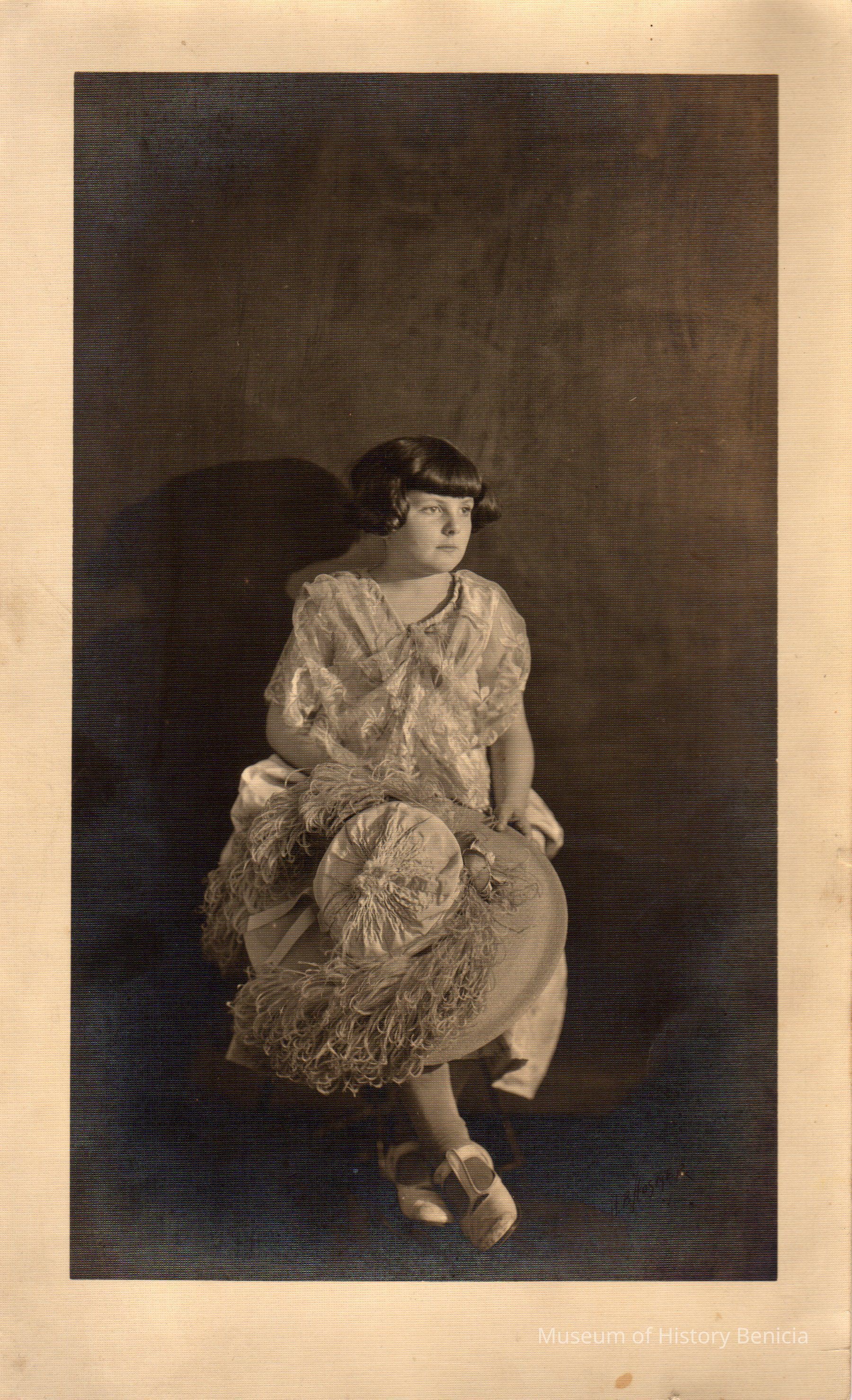 B/W portrait of girl seated holding a wide brimmed hat with feathers.