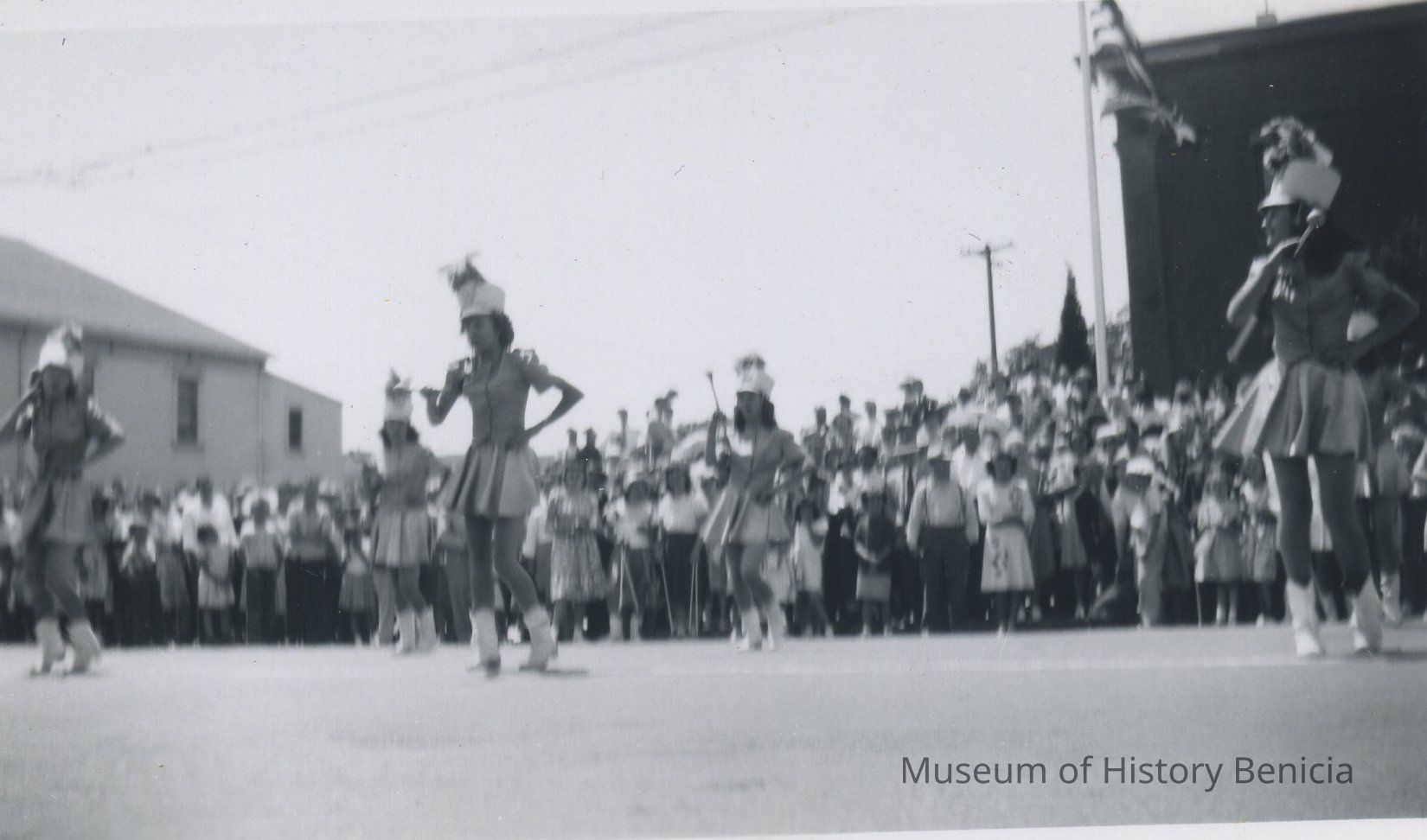 B/W Photograph - Parade on First Street; a group of High School Majorettes marches in the parade. That day the State Theater was showing the movie, "The Dark Mirror", which was released in 1946. So, it is likely this parade took place in 1948 during the Old Timers' Celebration;