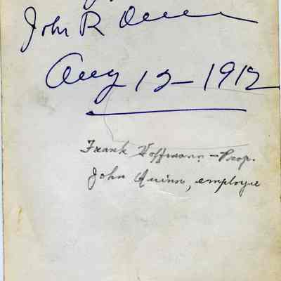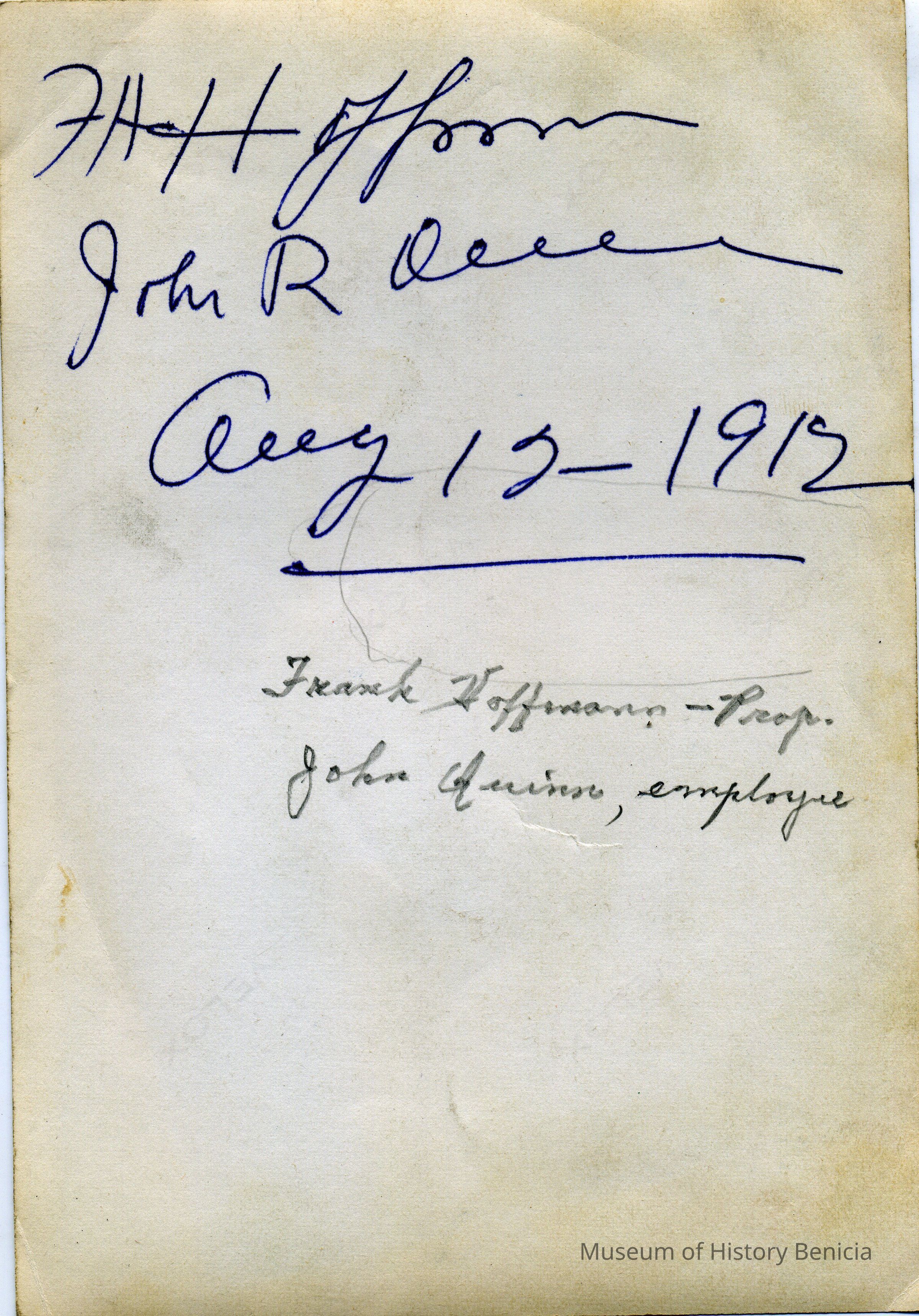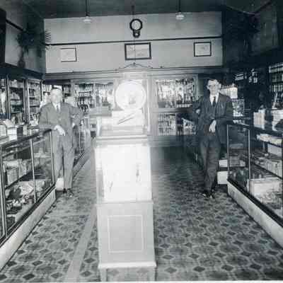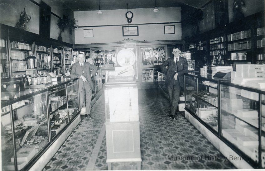 This is a photograph of Frank Hoffman (on left) and John Quinn (right). They are in the Hoffmann Drug Store in Benicia. John Quinn worked in Mr. Hoffman's store. The date on the back is 08/12/1912.Collection
