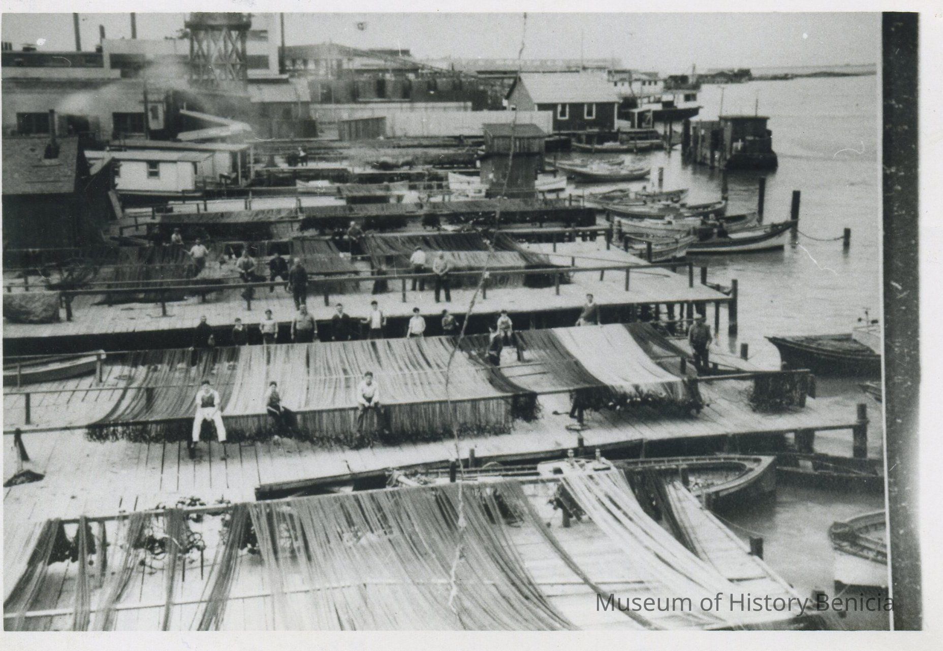 B/W photograph of a photograph: Fishermen drying and repairing their nets, scene at Pittsburg, CA