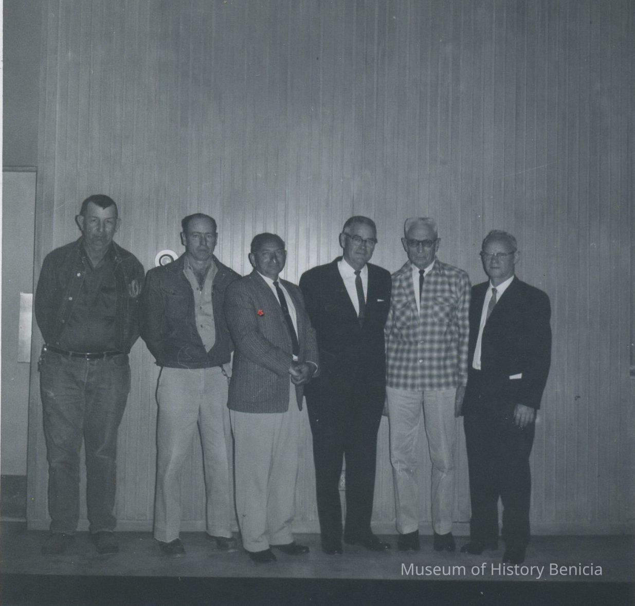 B/W photograph - Six men standing on a stage; could be a city or school district function;