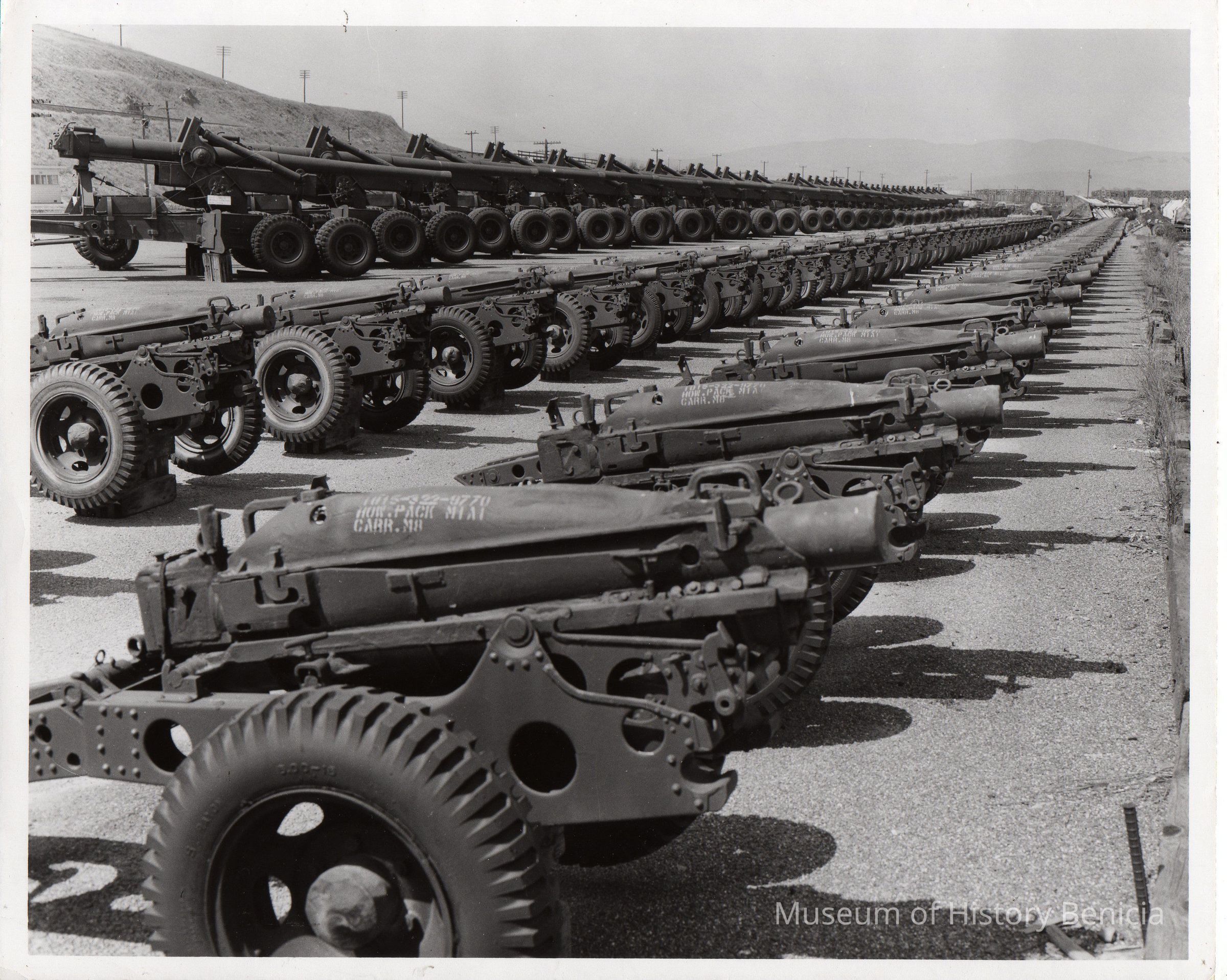 Storage area, Benicia Arsenal. Forefront: 75 mm Howitzers. Background: 155 "Long Toms". B/W photo.