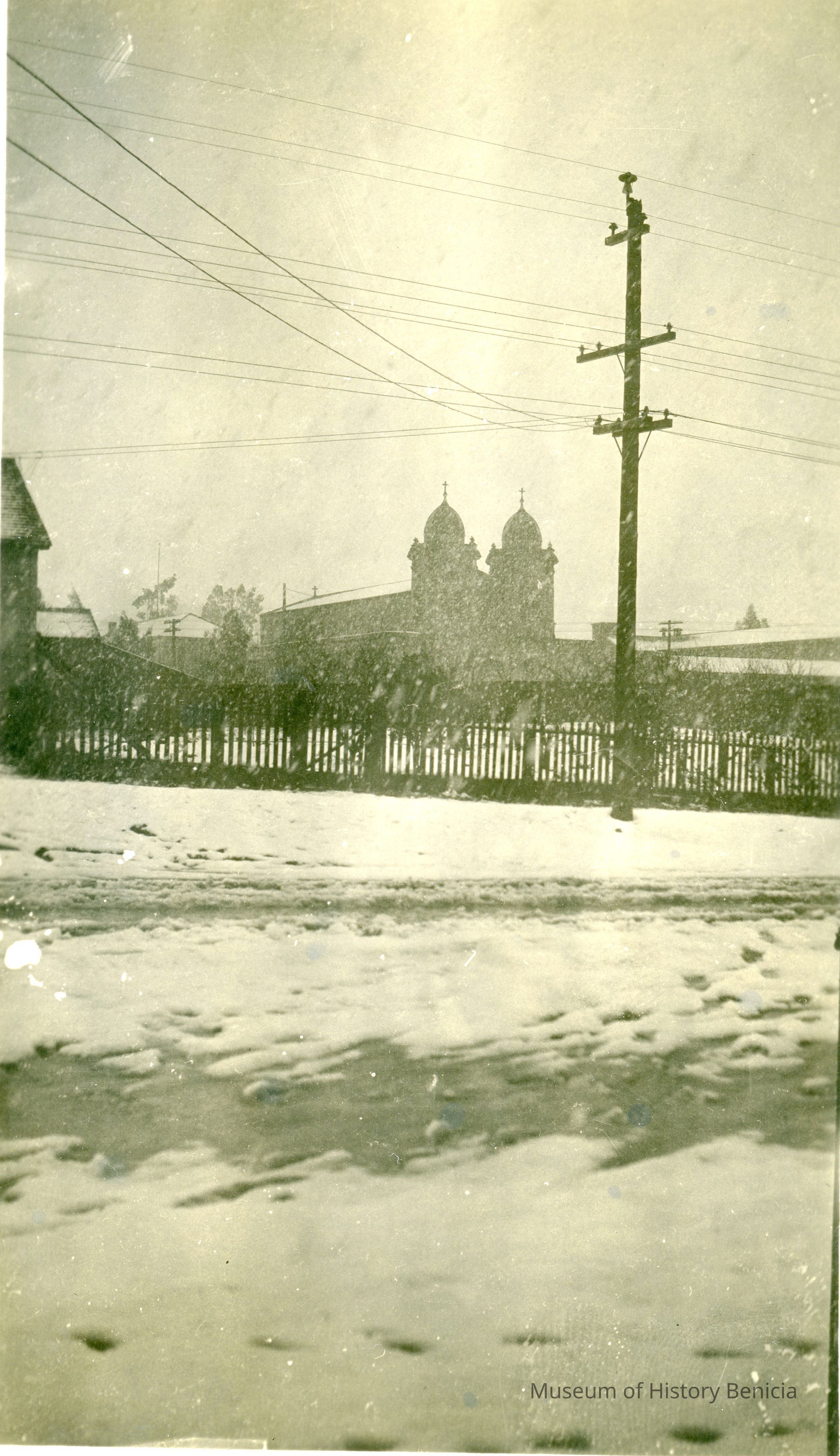 This is a photo of St. Dominic's church in the background and snow on the ground in the foreground.