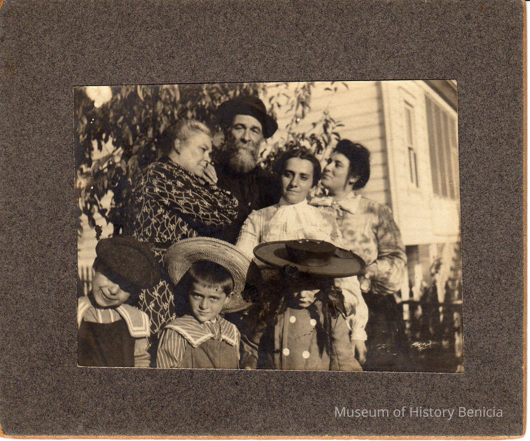 A man with a beard, 3 women, and 3 children. B/W photo.