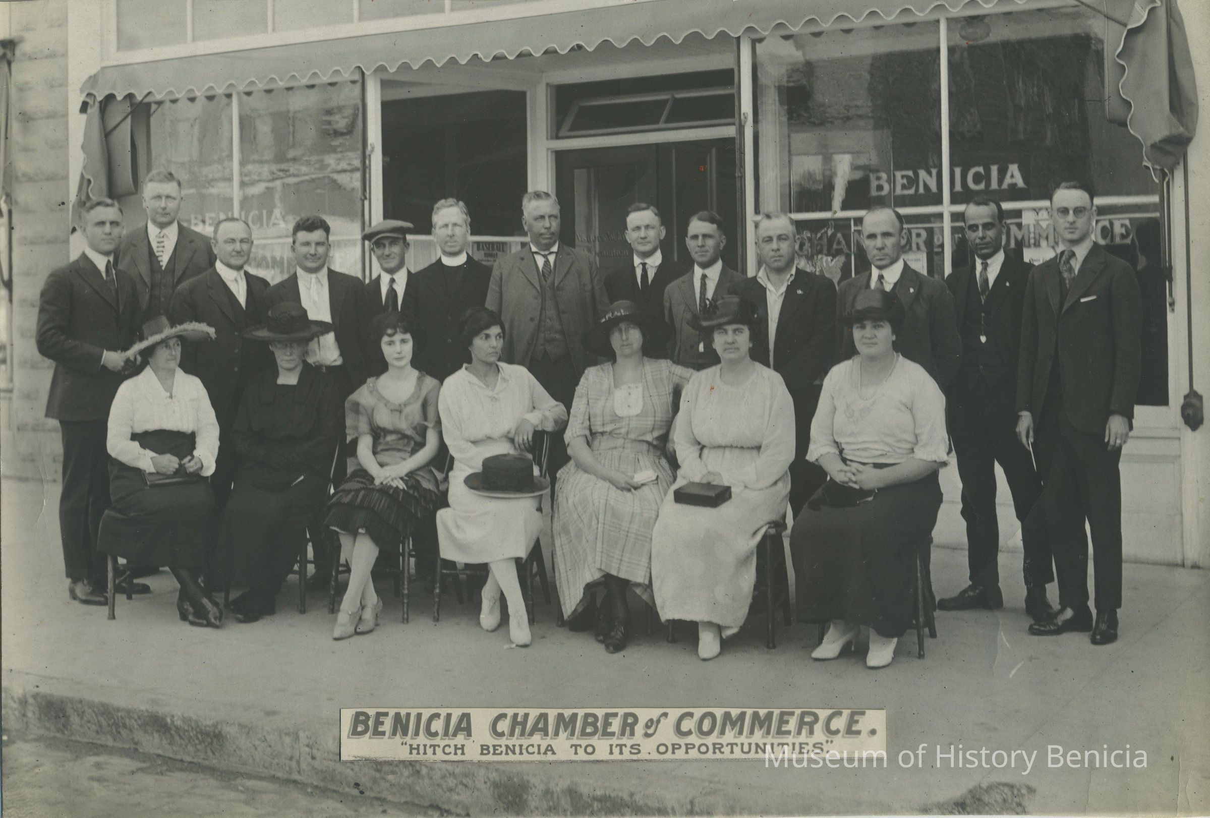 B/W photo of the Benicia Chamber of Commerce members with a banner over their heads that reads "Hitch Benicia to its Opportunities"Collection