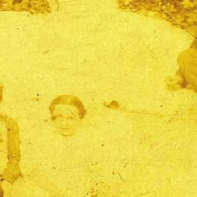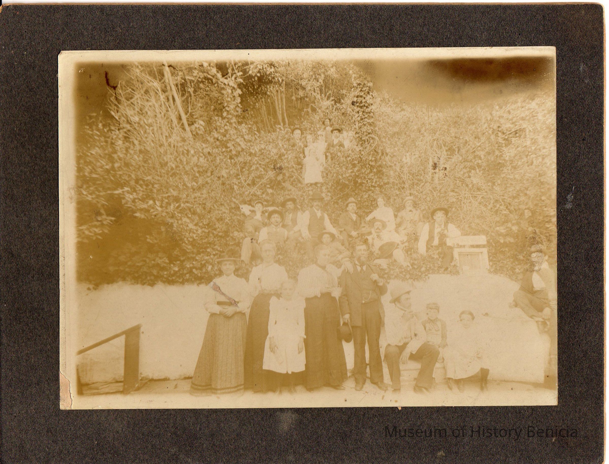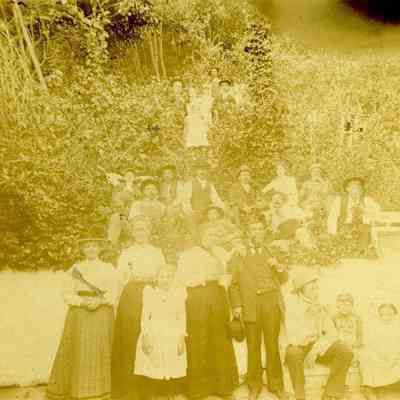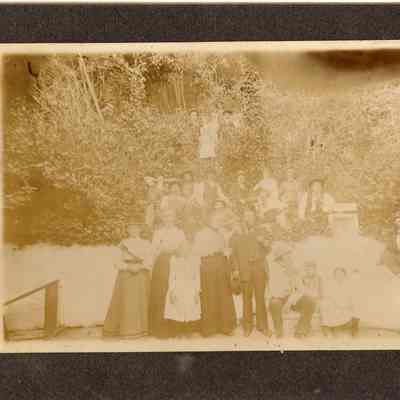 Black and white photo of a bunch of people standing. One man has a guitar or mandolin. The back has written on it "In the year 1900"Collection