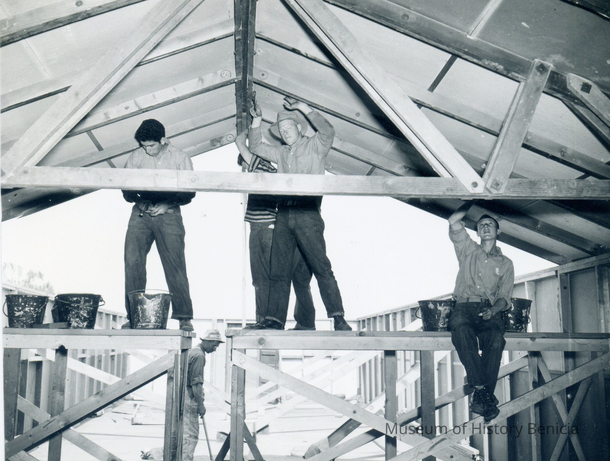 These are photos of the Benicia Arsenal at the time of WWII. They are copies of official Army photographs with the Benicia Arsenal number and date on most of them. This photo shows men building the framework for a building.Collection