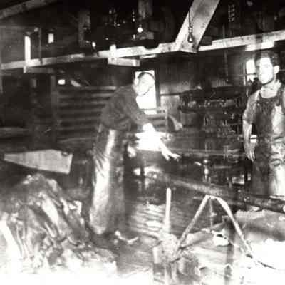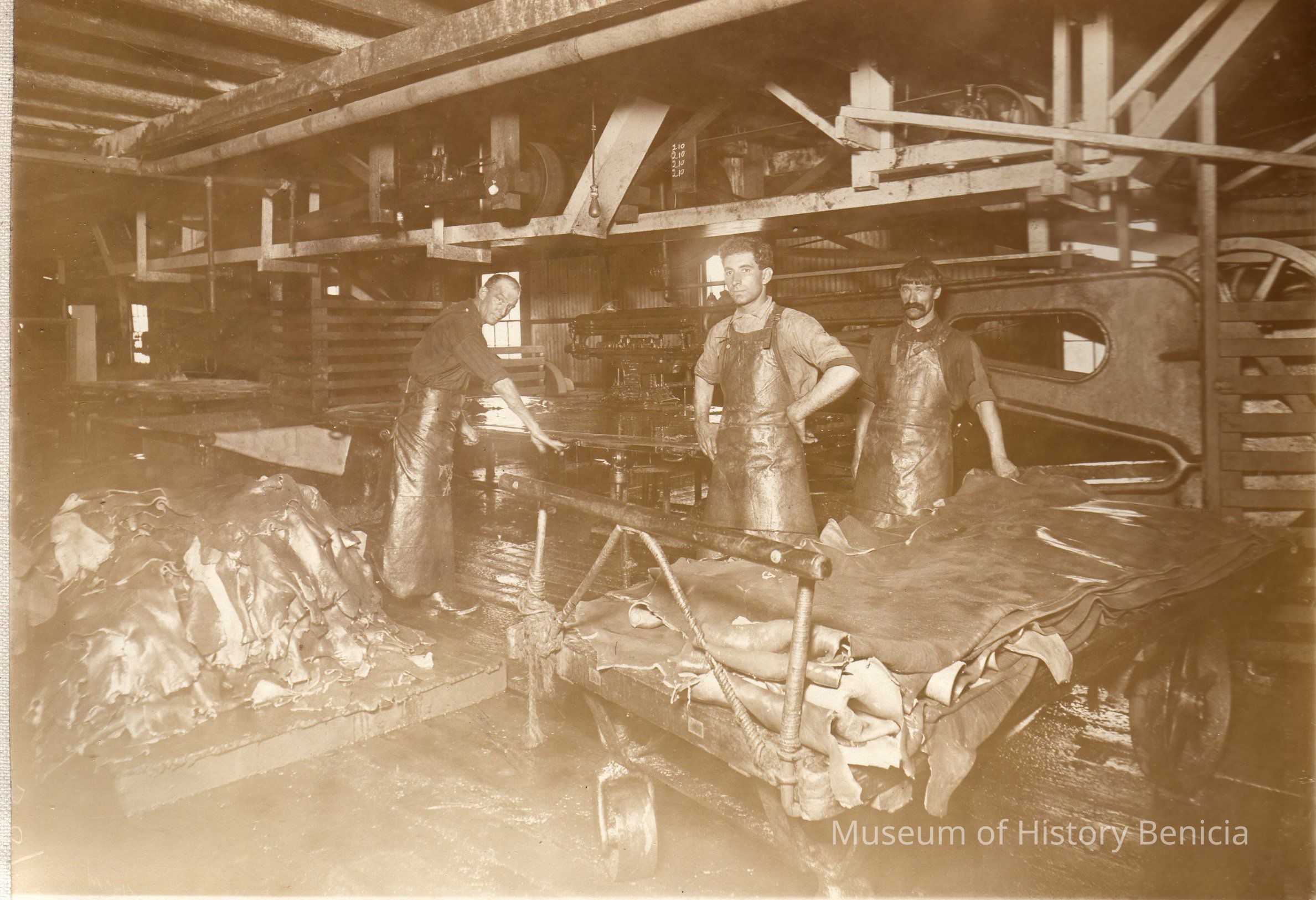 Sepia-tone photograph from an album: Workers at Kullman Salz Tannery sorting and grading hides.