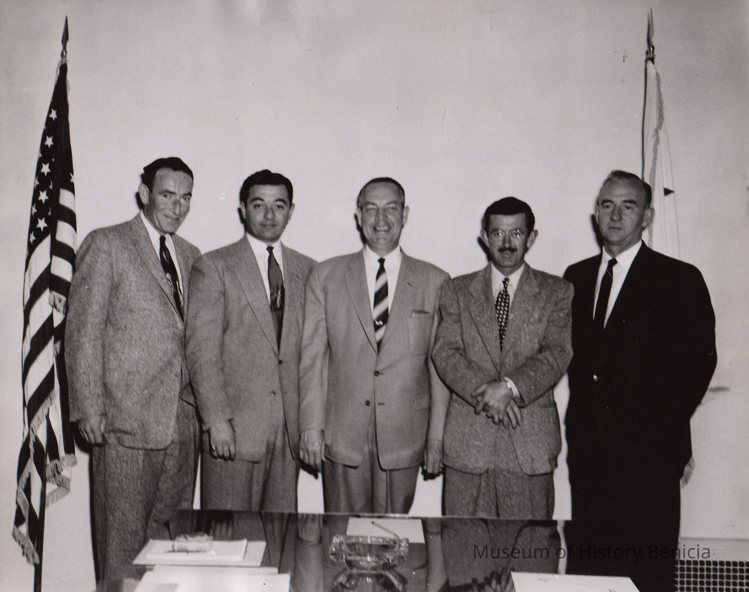B/W Photograph: Benicia city officials. L/R: Guil Du Mont, councilman; Bill Francis, Chamber of Commerce; James Walt, city administrator; Michael Walsh, councilman; John Bohn, city attorney.Collection