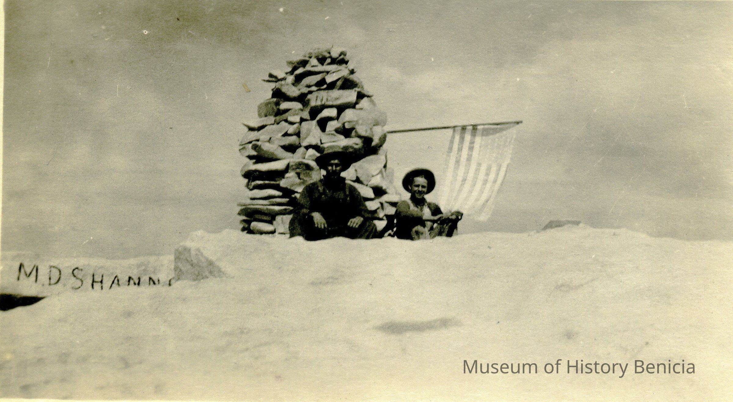 Two men leaning against a rock monument (?) with an American flag jutting out from the side.