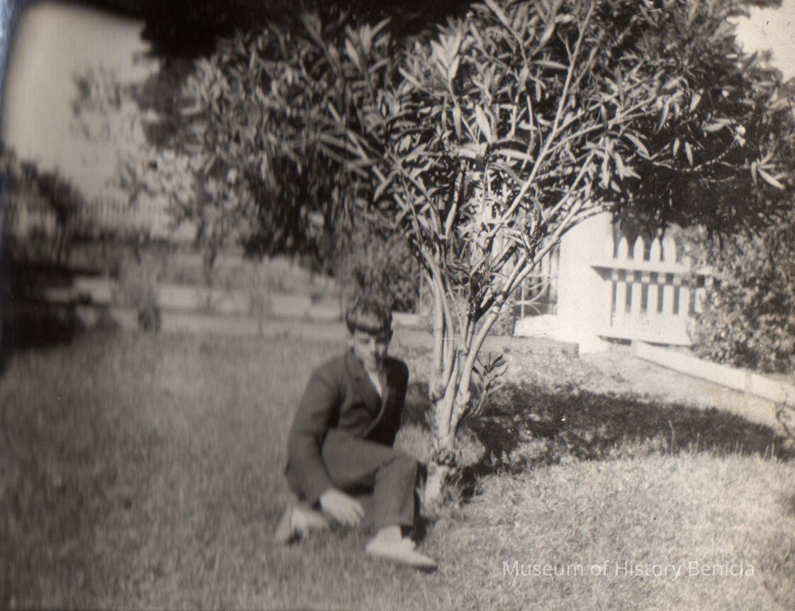 B/W photograph in an album: a young boy seated by shrub in the garden; it could be Valery ?, a friend of Laura Benet.