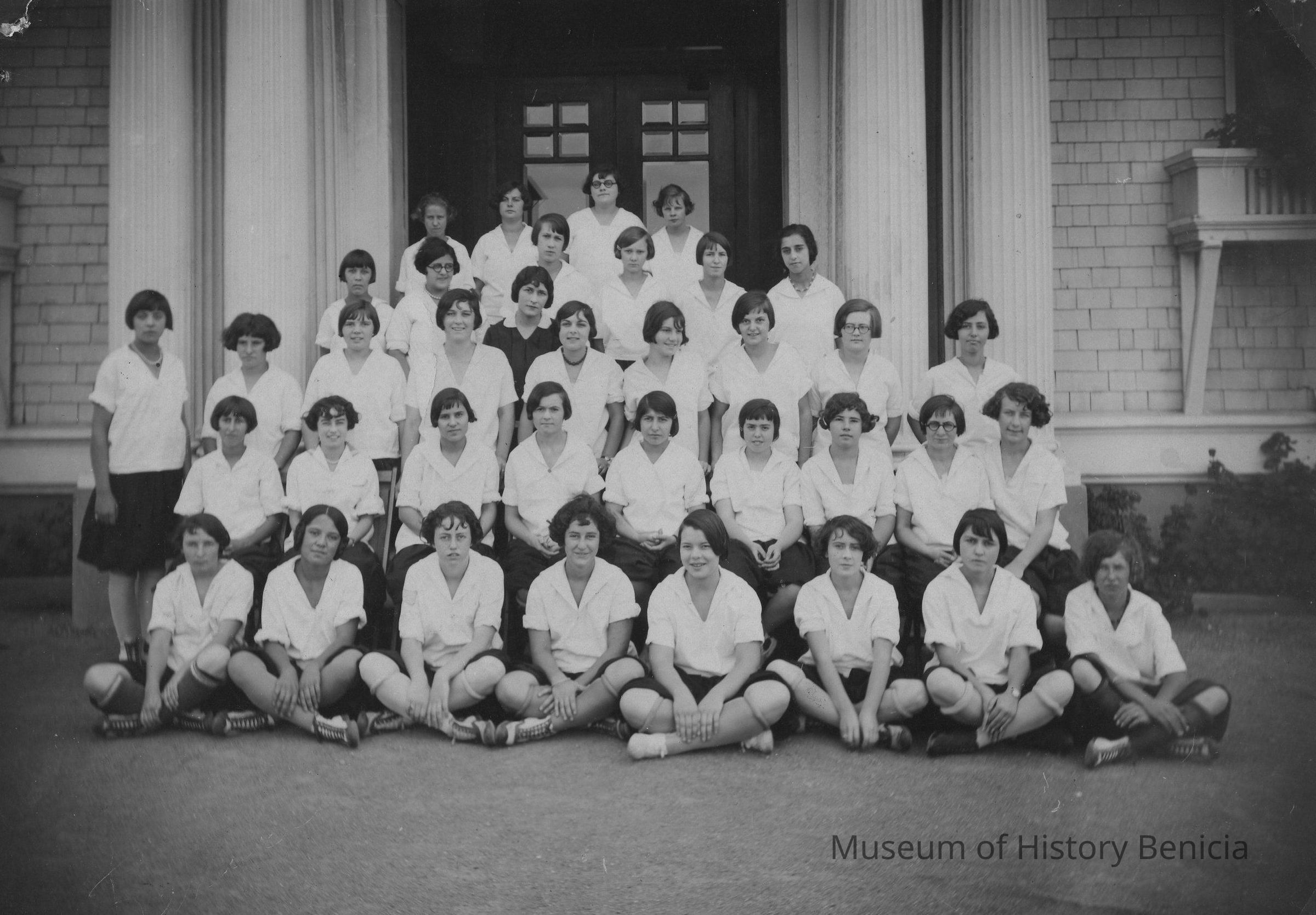 Black and white photo of five rows of young women, all but one in gym skirts, in front of shingled building. On back in ink: "1925 BHS" with names of all. In pencil by Harry Wassmann: "Donor to Benicia Museum Francis Carden".Collection
