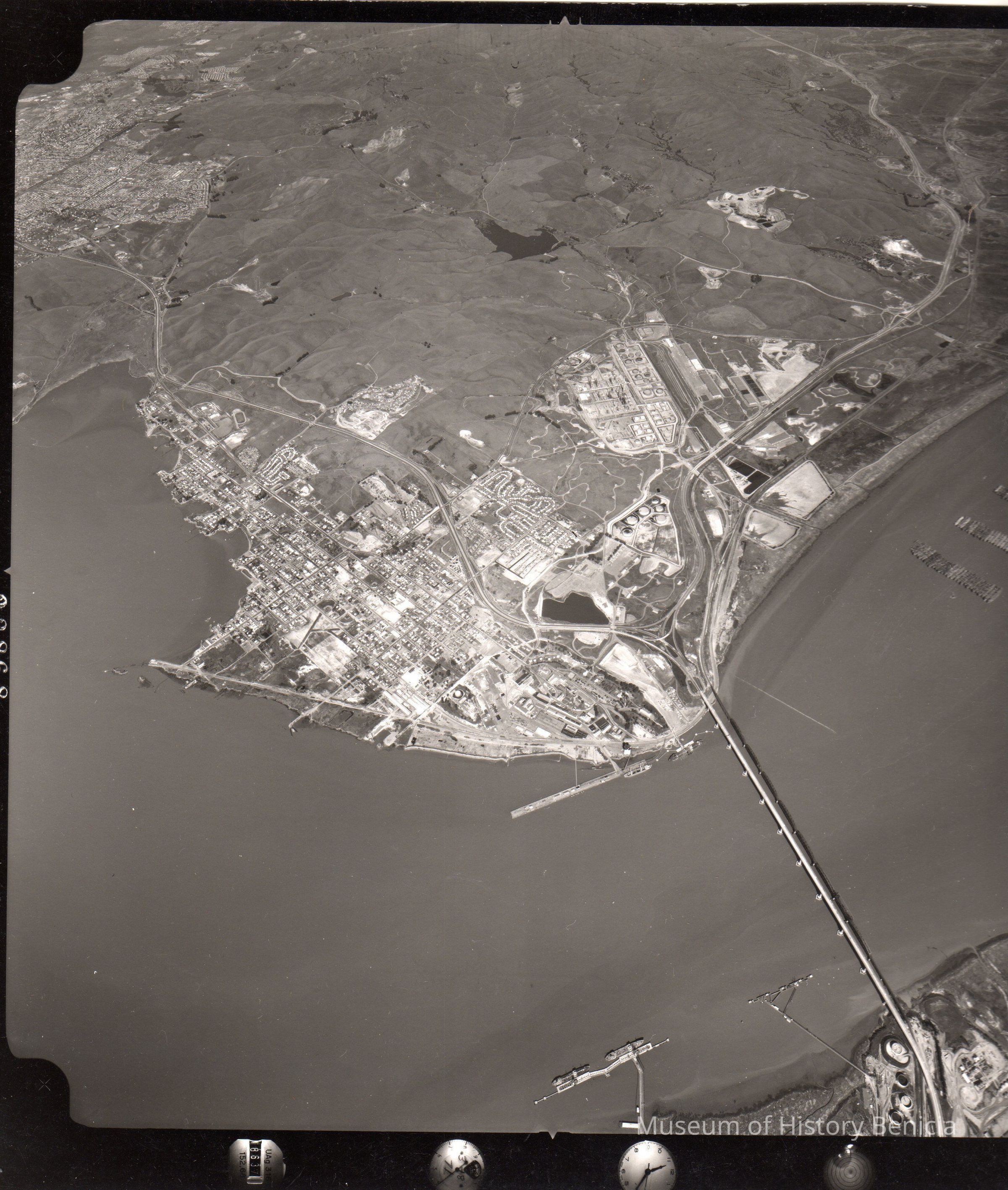 Aerial view of Benicia taken fron Martinez side; shows bridge, city, arsenal and Mothball Fleet. Black and white photo.