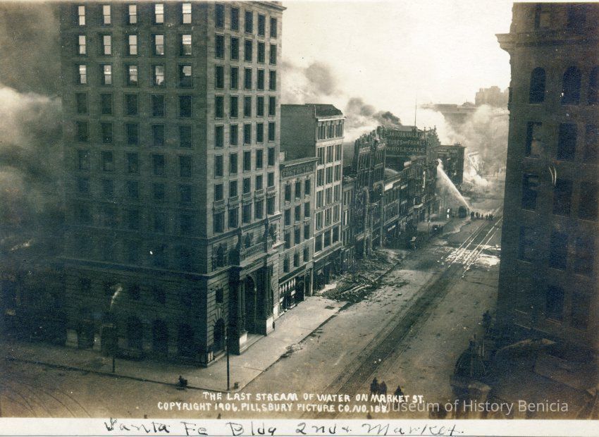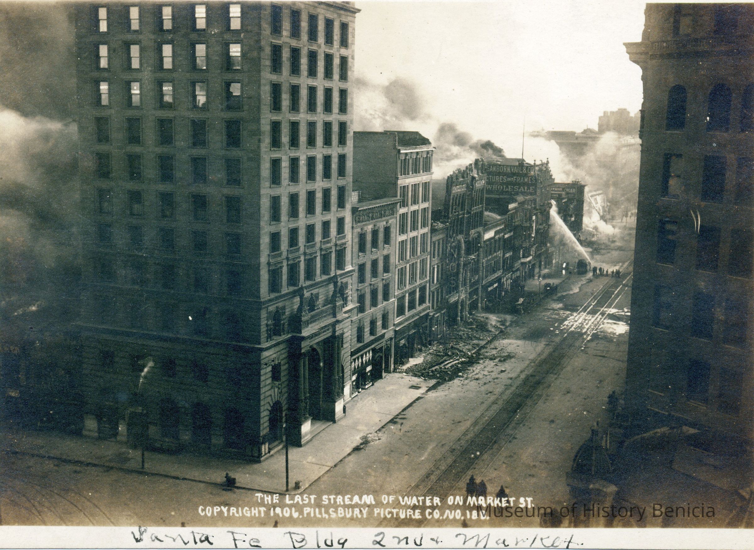 This photo is of firemen putting out part of the fire after the SF earthquake of 1906. It shows a view down Market Street. Written on the bottom it says "Santa Fe Bldg 2nd and Market"Collection