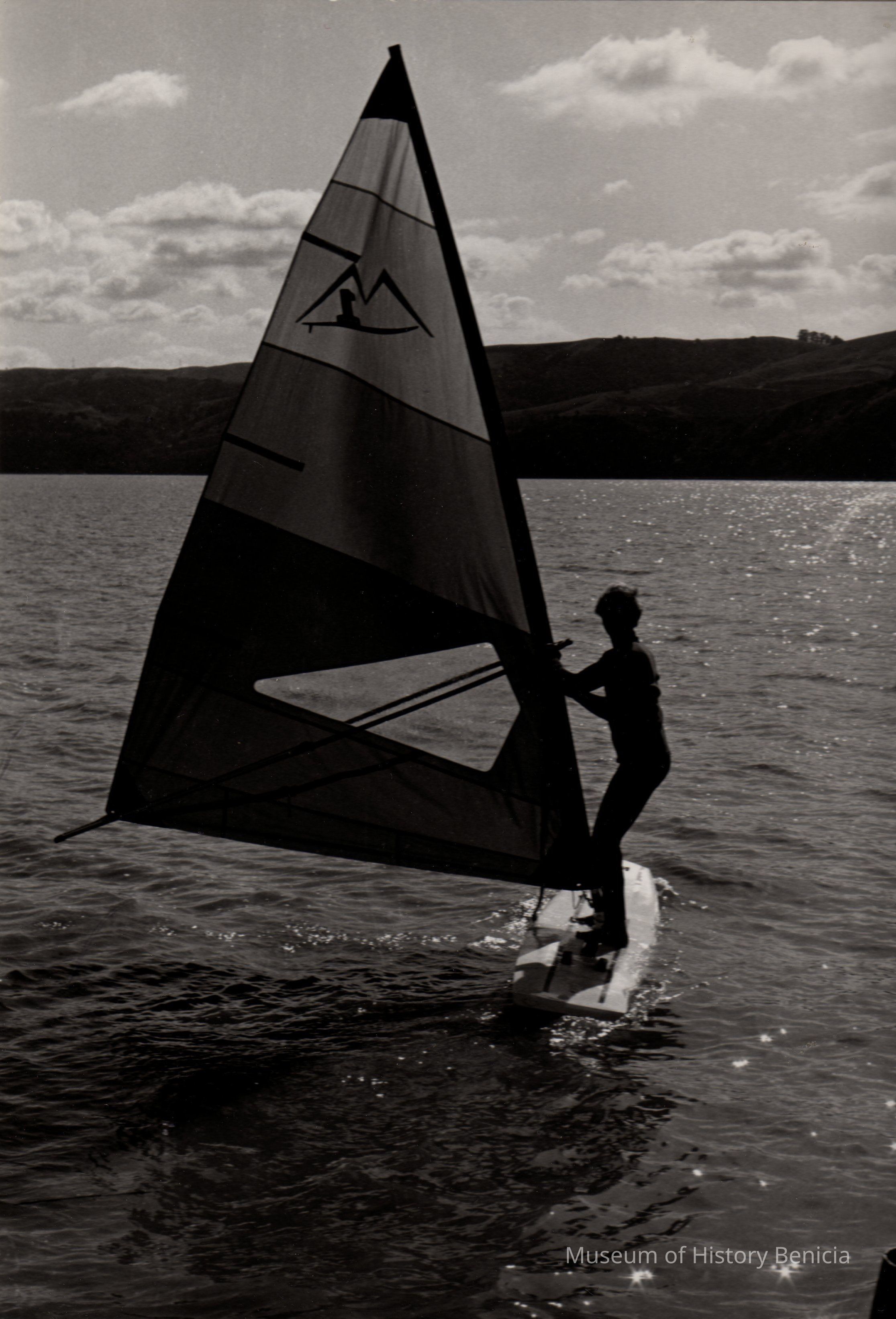 Black and white photo of a man windsurfing.