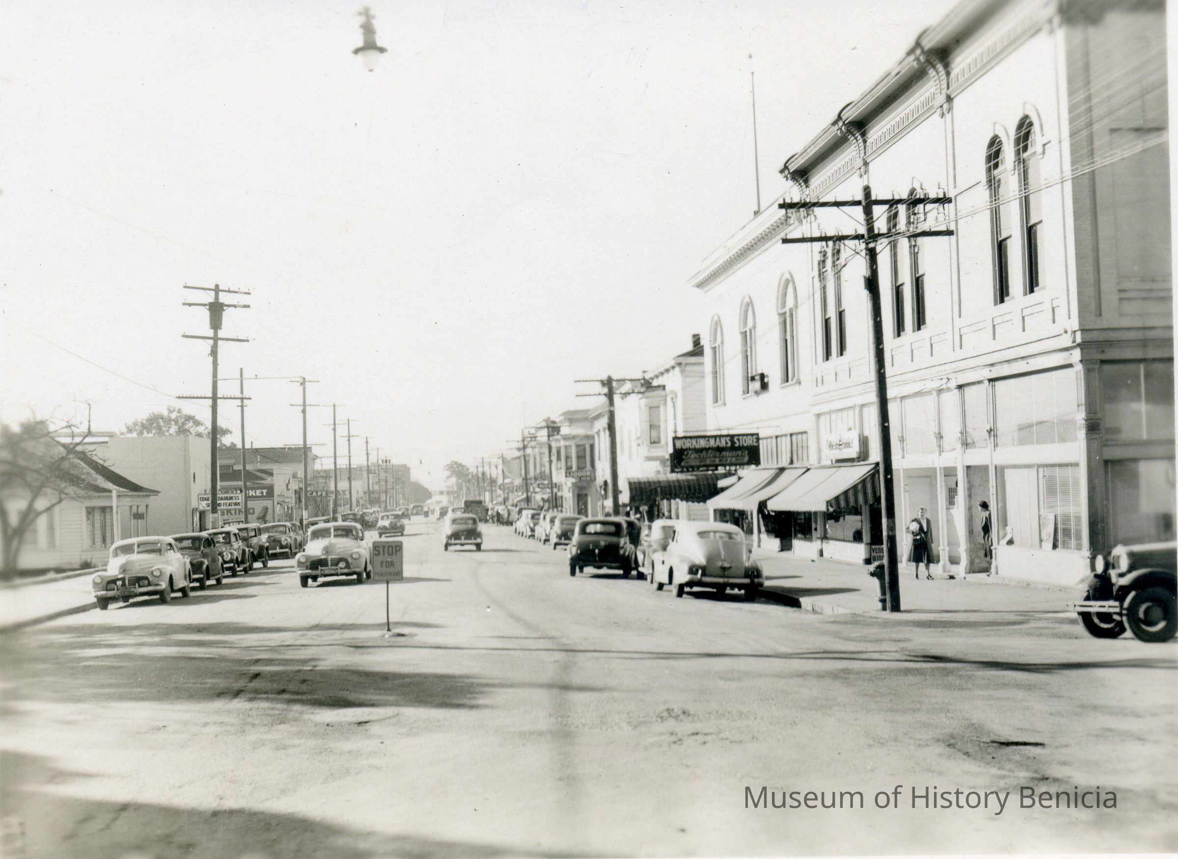 This is a photograph of First street in Benicia taken in the 1940s. A store sign on the right reads "Working Mans Store", Tochterman's and the movie "Edge of Darkness" is advertised on the marquee at the movie theater on the left. (This WWII war movie was released in1943 and starred Errol Flynn and Ann Sheridan.) The movie theater may is the Victory theater which closed in the 1950s.Collection
