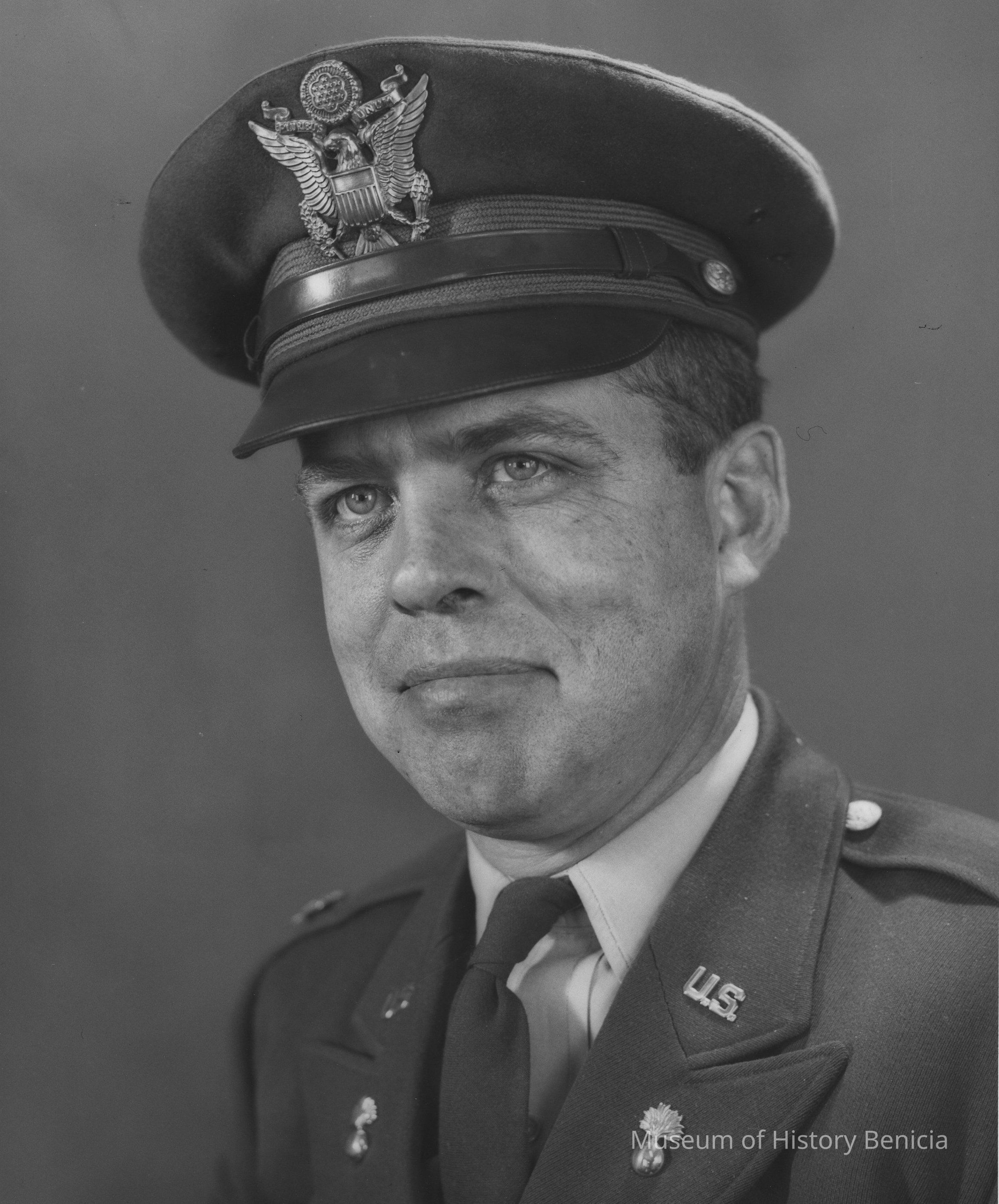B/W Photograph: head shot of an unidentified late-middle-aged man in army uniform and cap. On back: "U.S. Army photo stamp, "04071-285-1/AM-55".