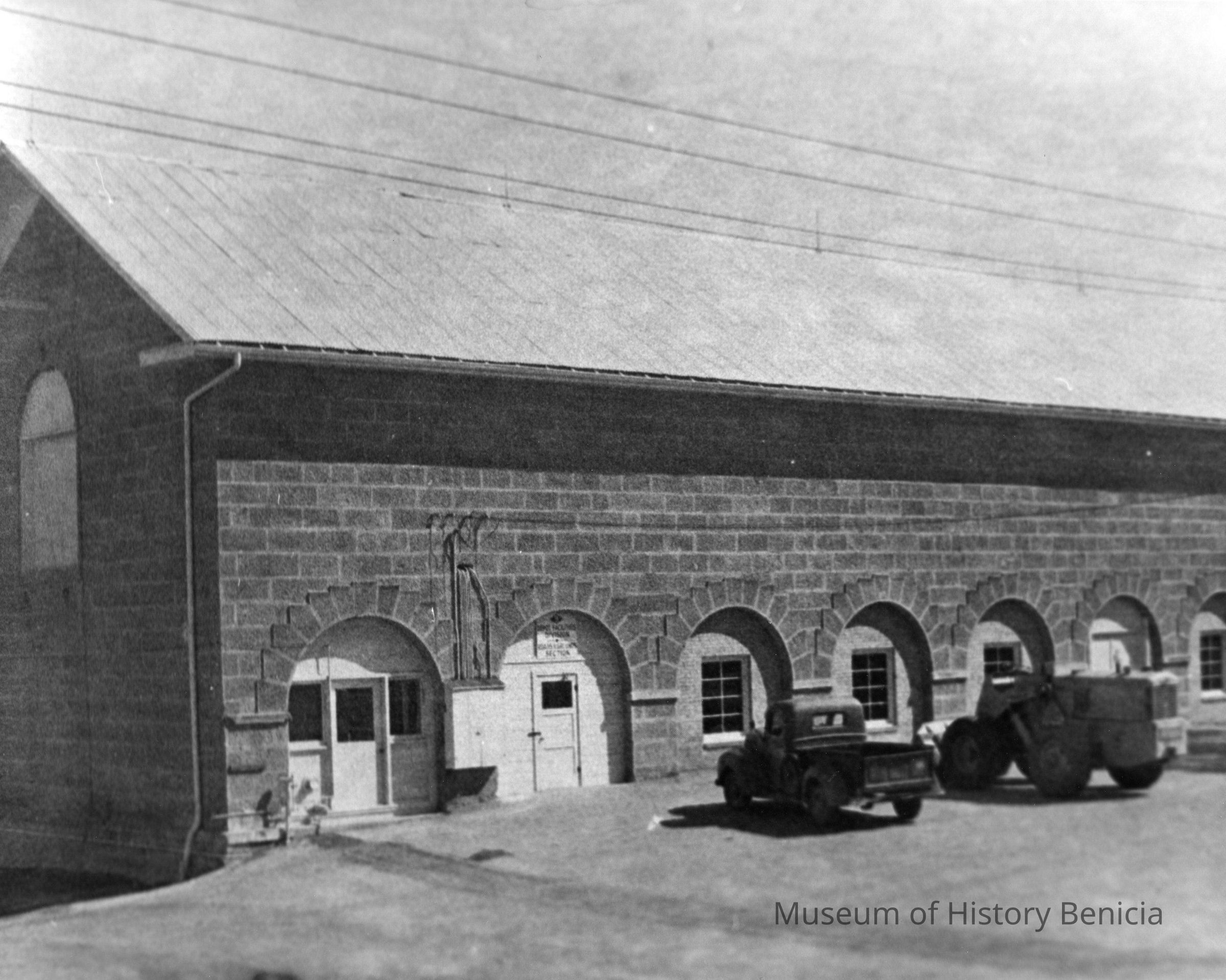 Building #9, Benicia Arsenal Ammunition Shop, built in 1854. It cost $17,000 to build. It is now used by the Camel Barn Museum. Black and white photo.Collection