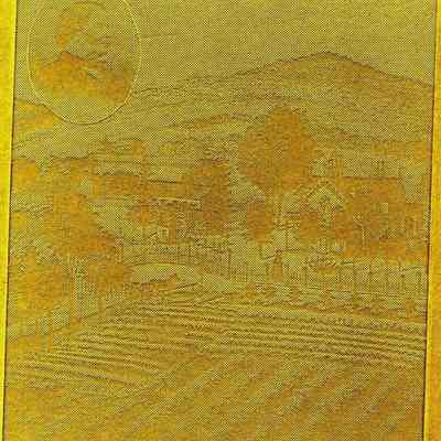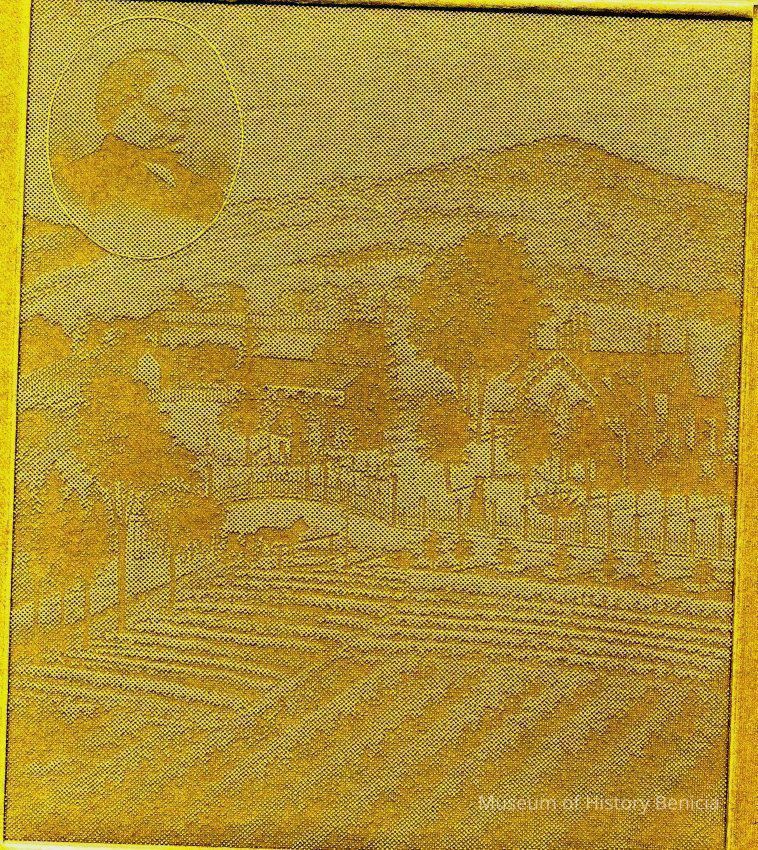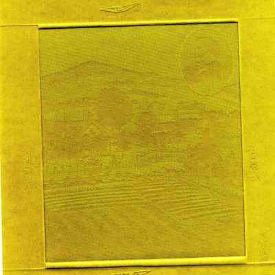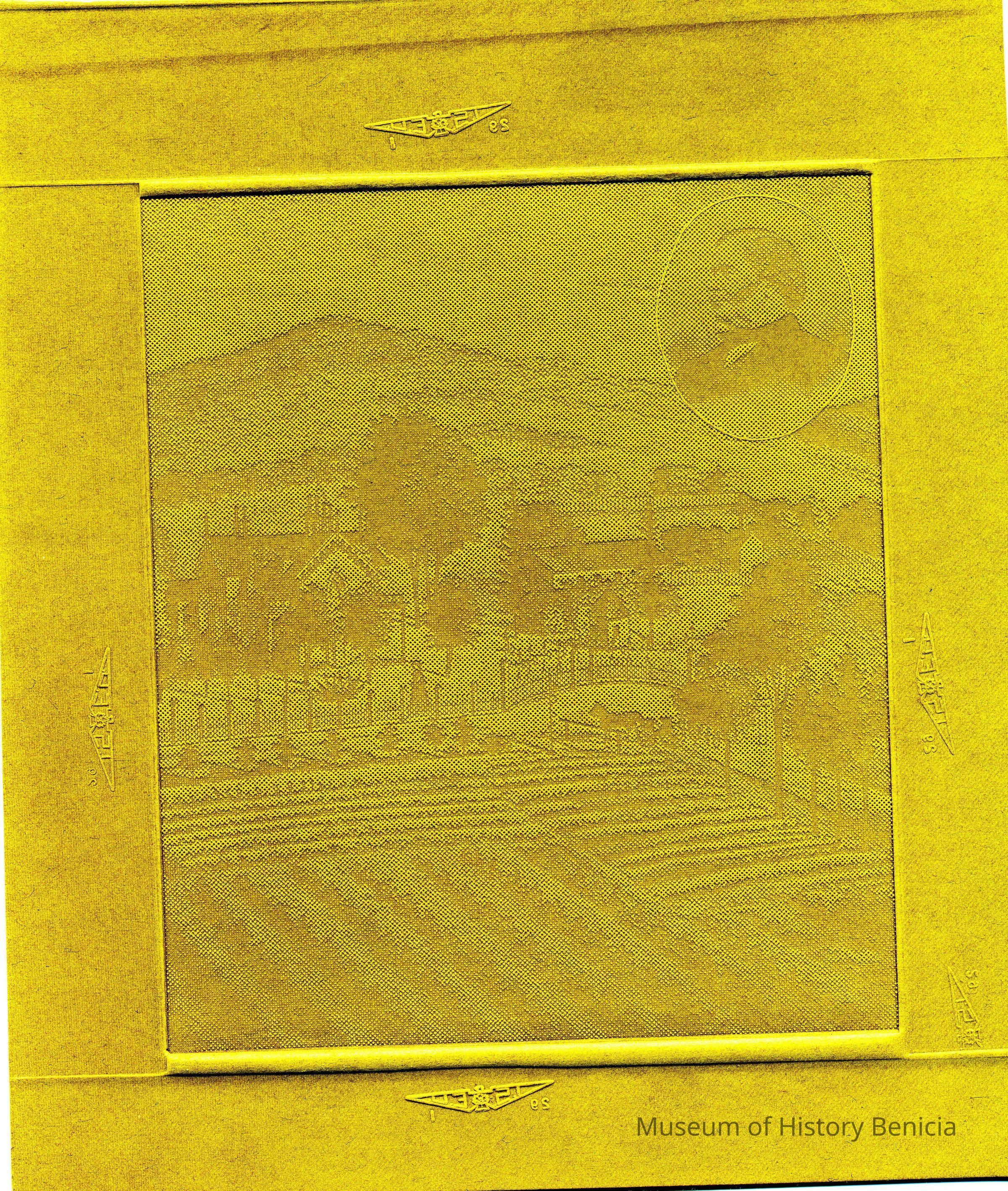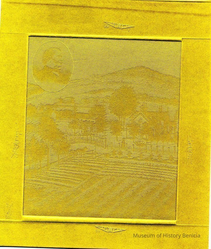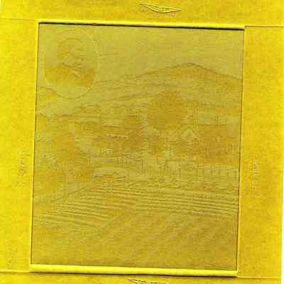 An image pressed into green cardboard of fields and a carrige. In the corner is an oval with the portrait of a man. Looks like a cardboard plate used for etching prints. Not sure.Collection