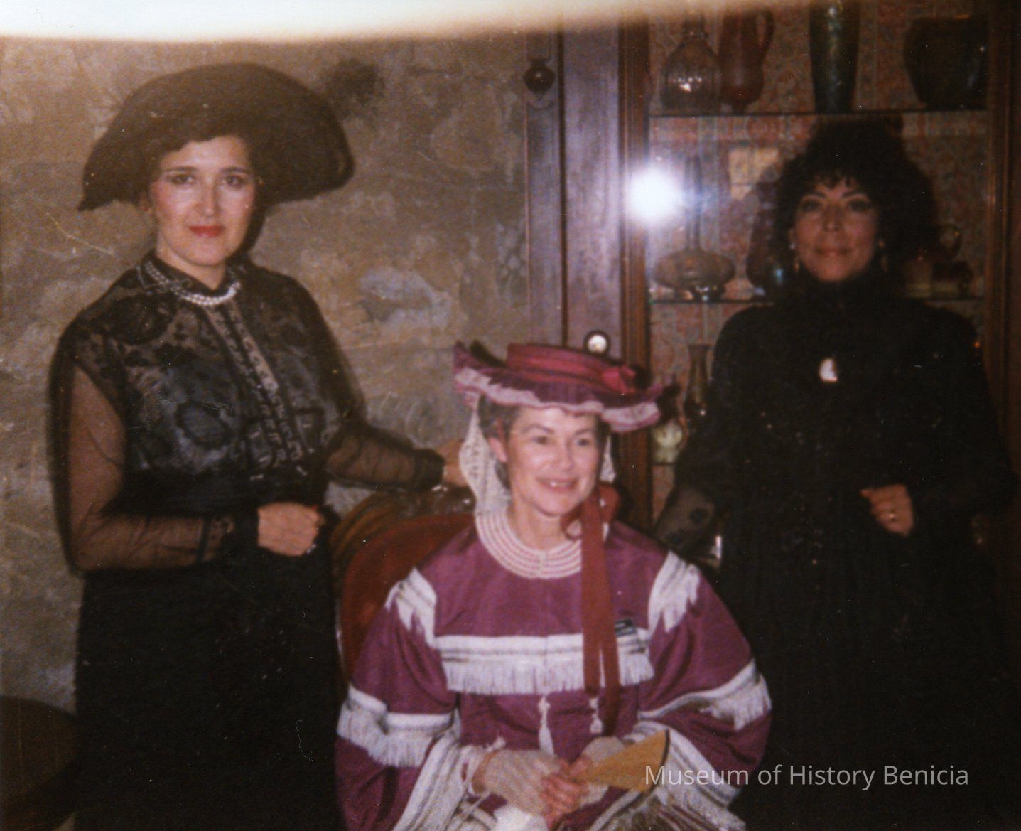Color photograph of (left to right) Maria Dempsey, Marjorie Williford, and Cynthia Giroux dressed in period 19th Century costume. Unspecified Benicia Historical Museum event.