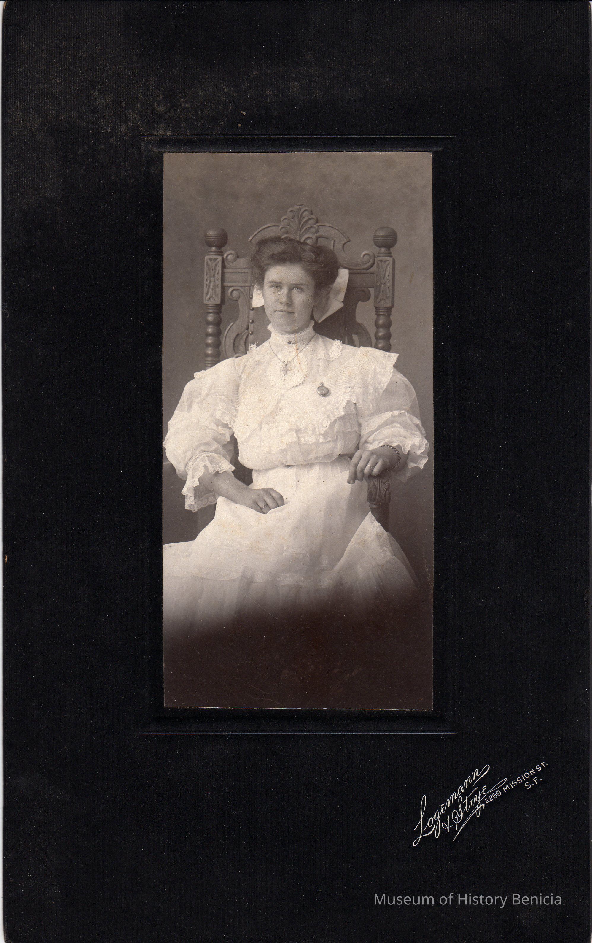 B/W portrait of unidentified woman wearing a white dress