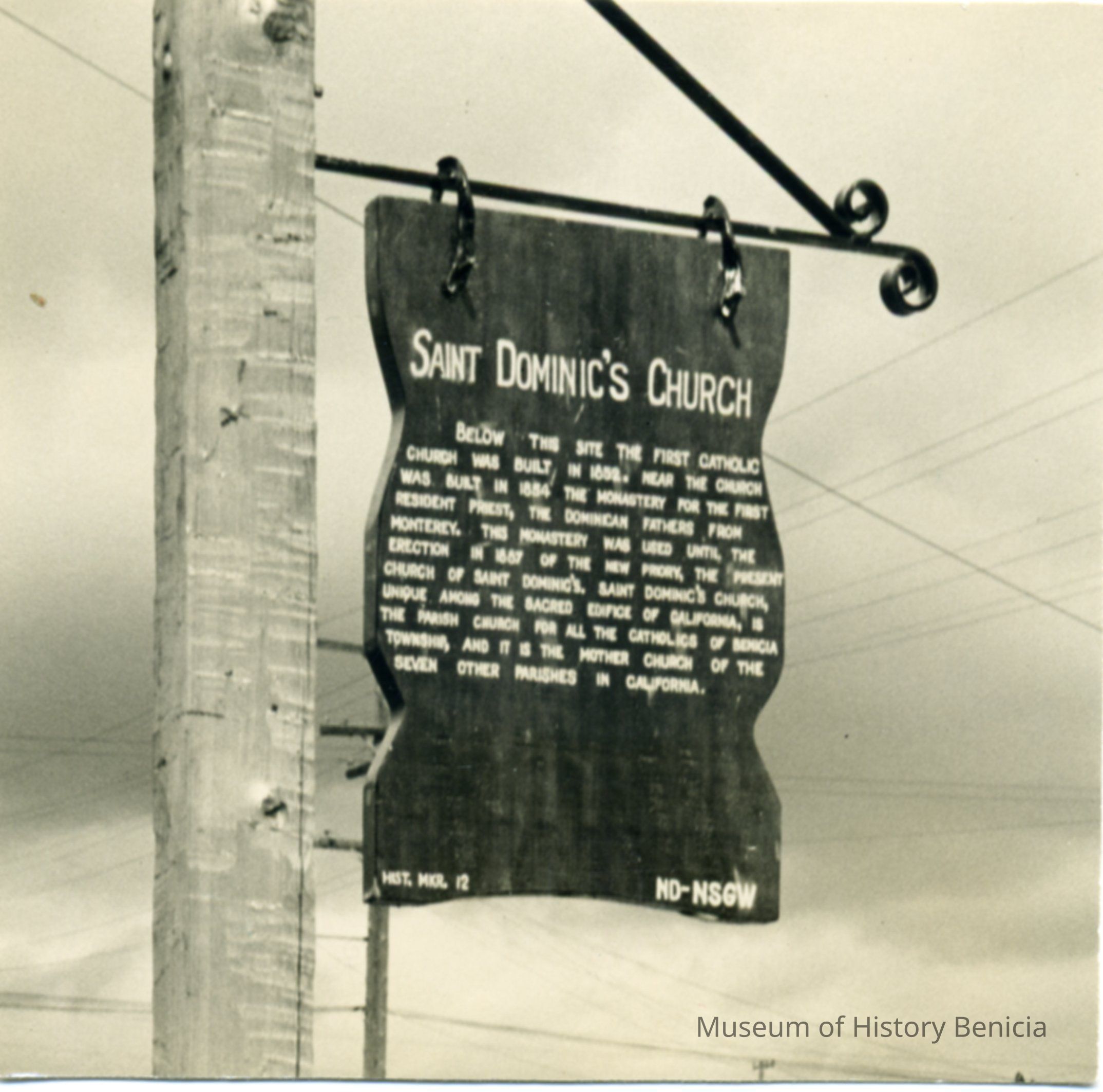 Photo of the sign eredted for Saint Dominic's Churc at the 100th anniversary celebration of Dominicans in California. It was erected at 5th and I street in Benicia.Collection