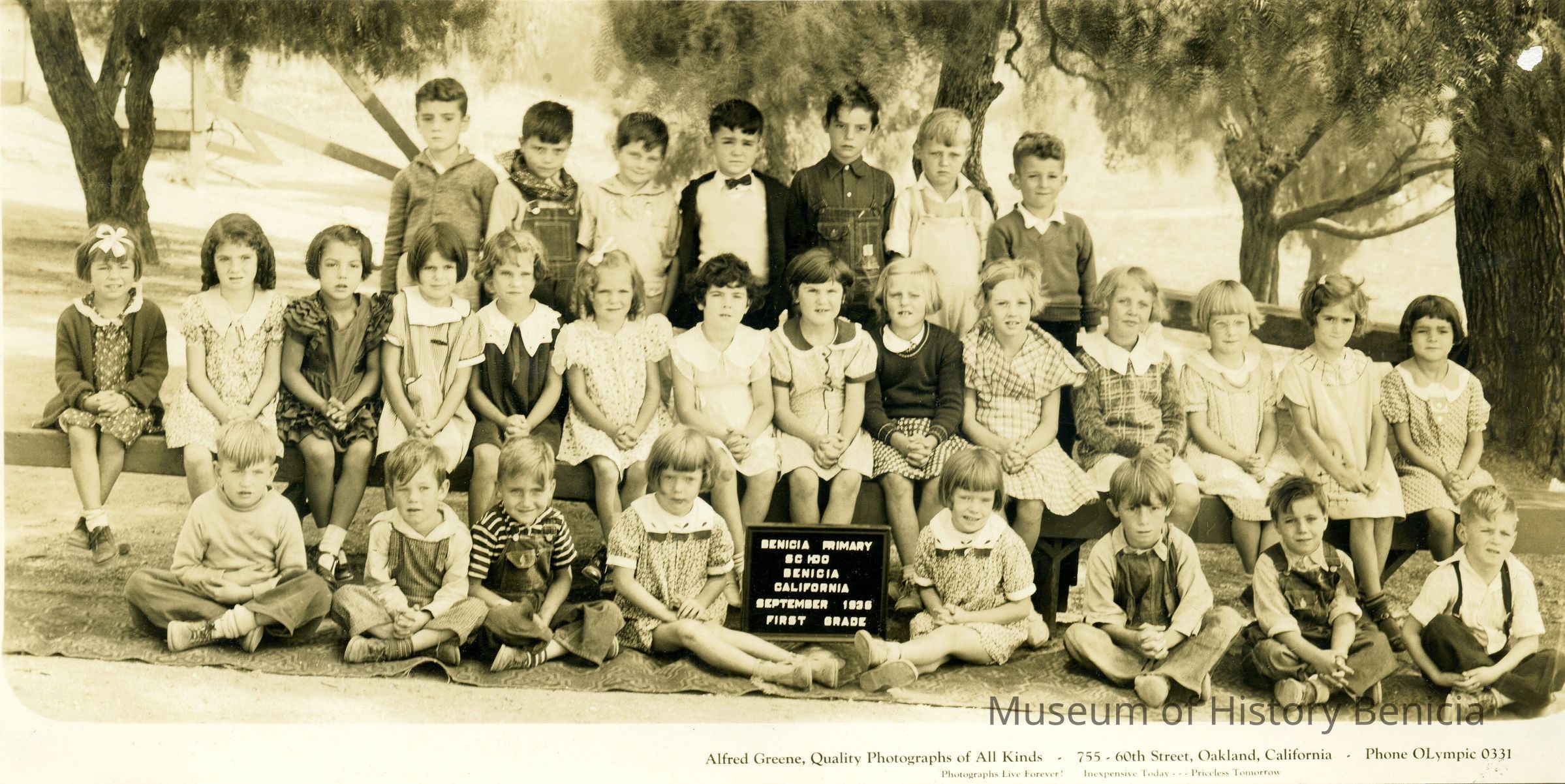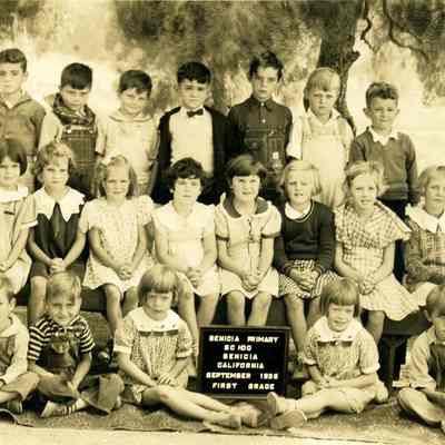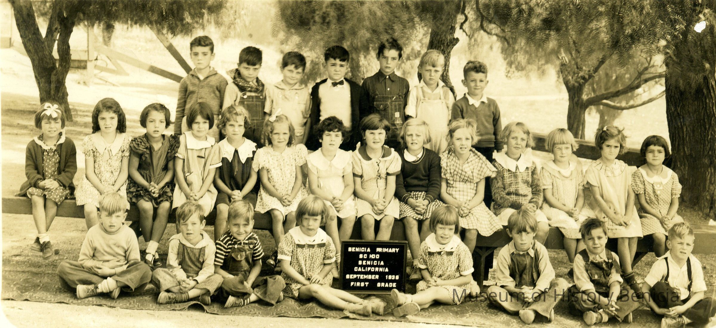 Photo of a class in Benicia taken in the City Park. It is the 1936 First Grade class. There are no names listed on the back.