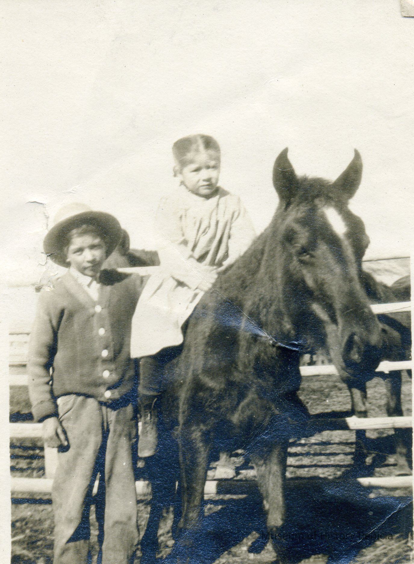 A photo of a girl on a horse with an older boy next to her. On the back is written "Oct 1911.