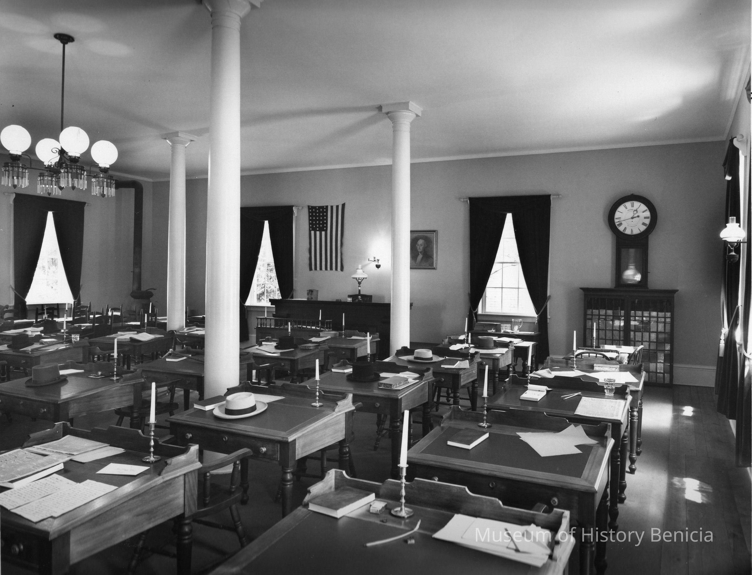 B/W photo of the restored Benicia State Capitol interior. Shows Senate chamber on ground floor.