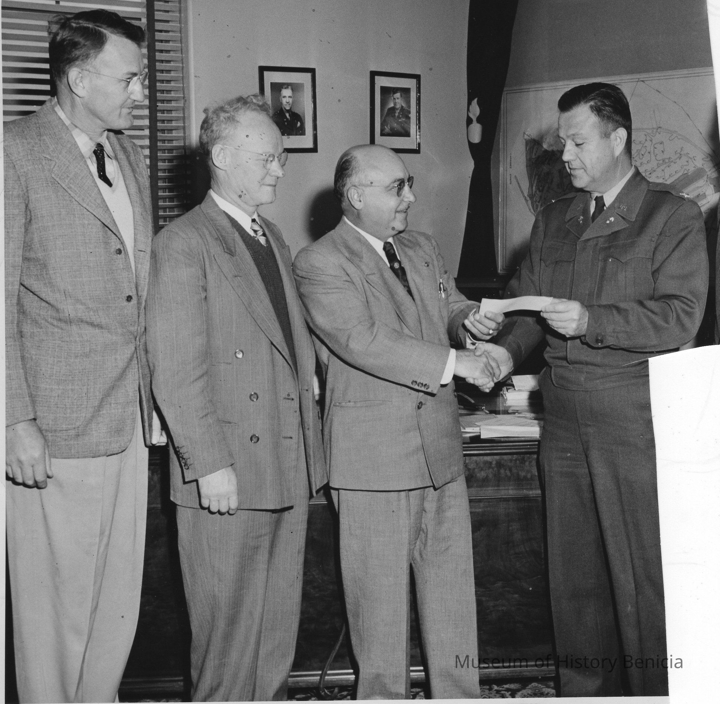 B/W photograph: four men and a check in an office. L/R: "Michael Fitzgerald, Mayor, later Postmaster"; "Joseph Henderson, Grade School Superintendent"; "Michael Rago, Banker"; "Col. Francis Hall, Benicia Arsenal". On back are identifications in ink and U.S. Army photo stamp.Collection