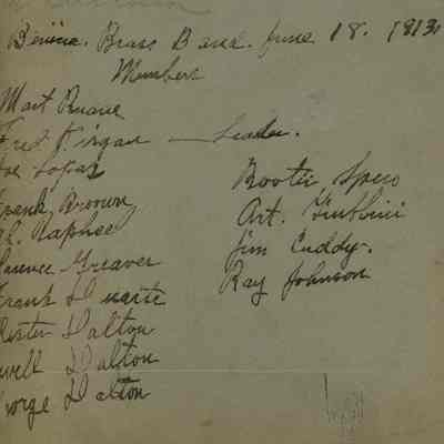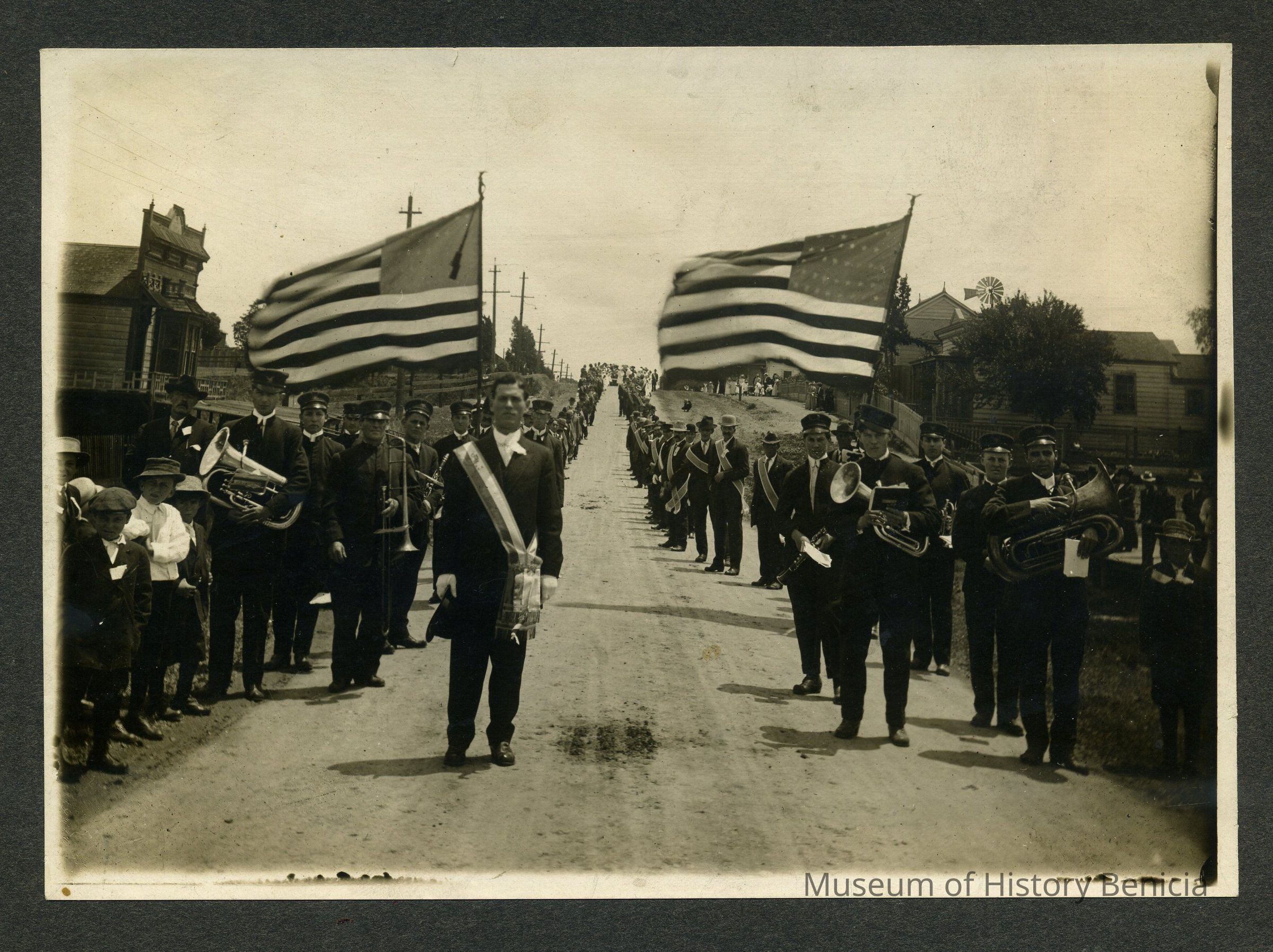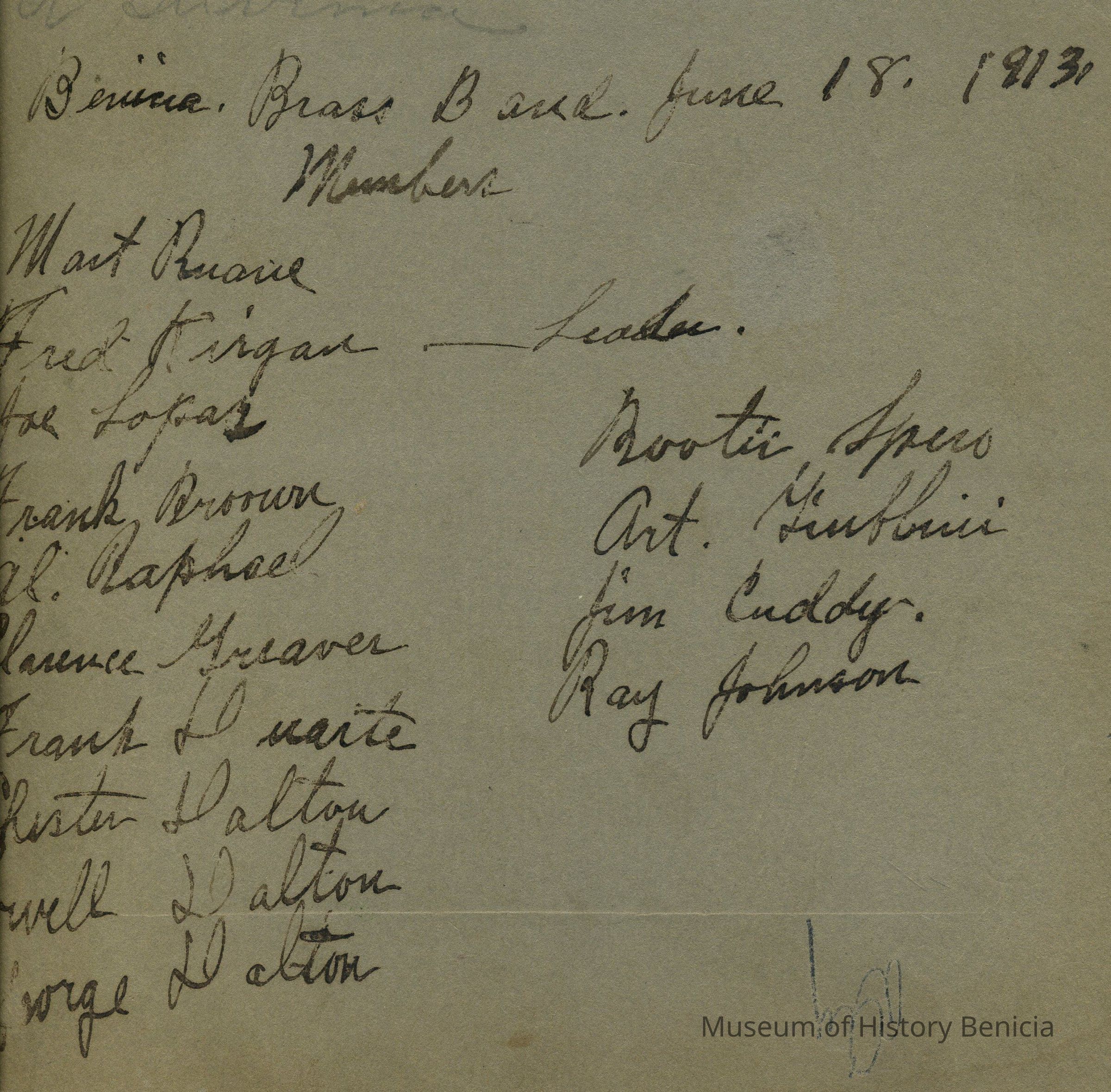 B/W Photograph on mat board - Benicia Brass Band on June 18, 1913. They could be marching in the Holy Ghost Parade of that year. Some members names are on the back: (as best as they can be read) Mast Ruarie, Fred Kirgan - Leader, Joe Lopaz, Frank Broown, Al Raphael, Clarence Greaver, Drank Duarte, Chester Dalton, Lowell Dalton, George Dalton, Bootie Spiro, Art Giubbini, Jim Cuddy, Ray Johnson