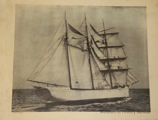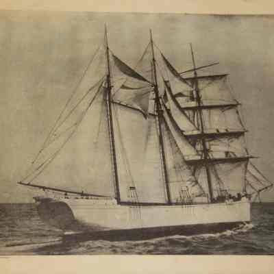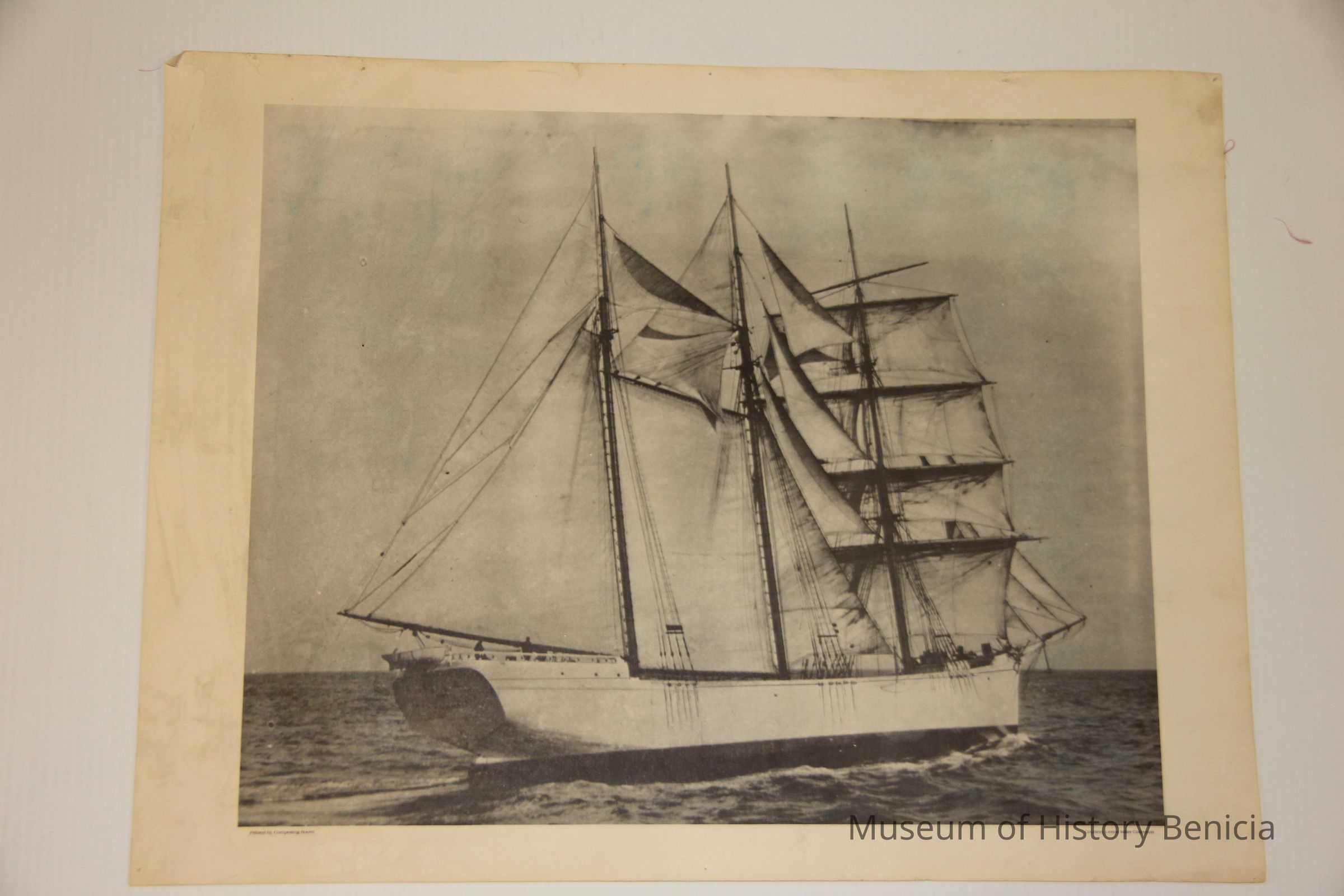 Enlarged photo of a sailing ship at sea under full sail. The photo was printed at the "Composing Room" and was part of the LeNoir Miller collection.Collection
