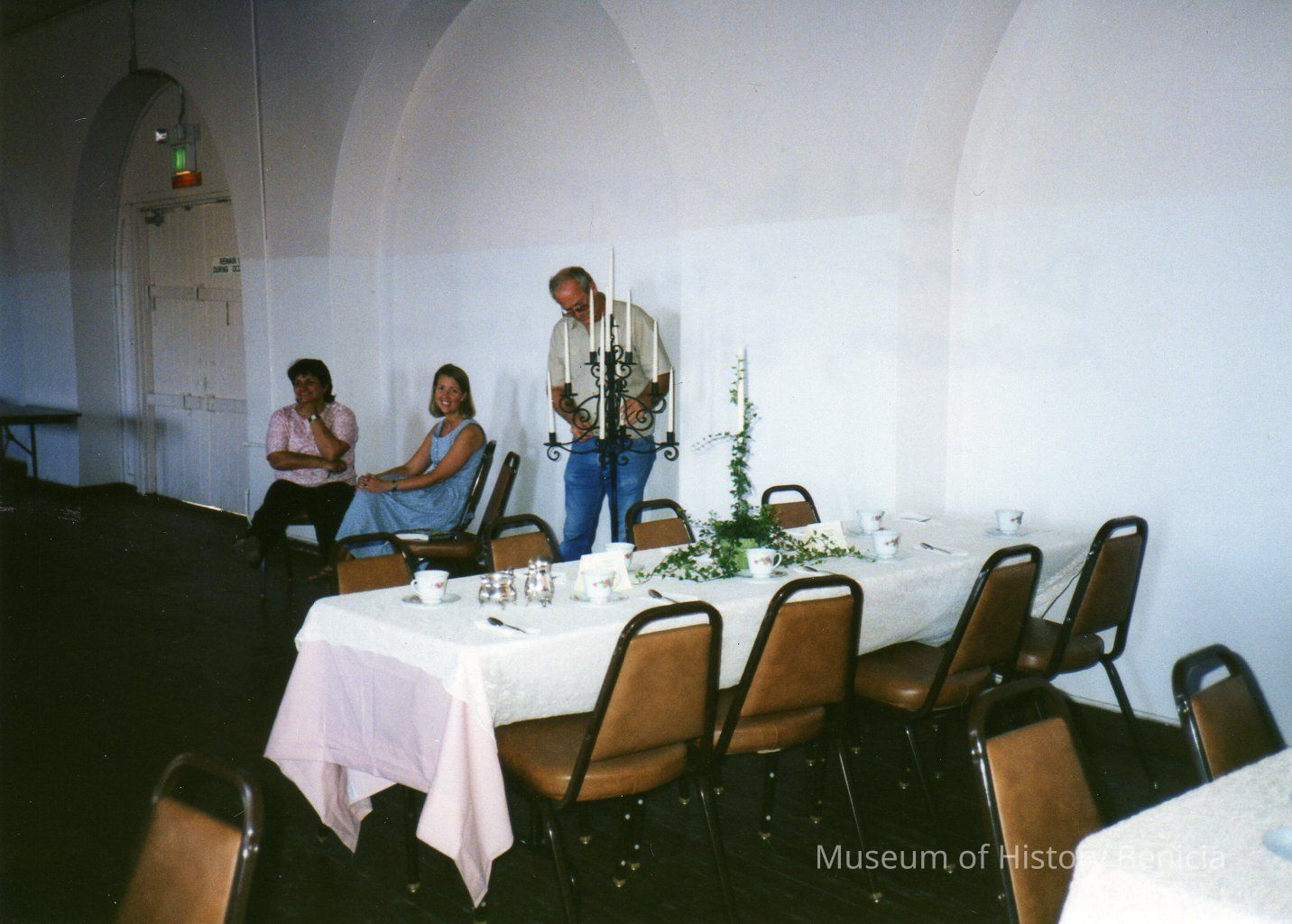 color photo of Darlene Anderson, seated; Lisa Ericson, seated; and Ray Shehan, standing and adjusting a candelabra (per back of photo)Collection