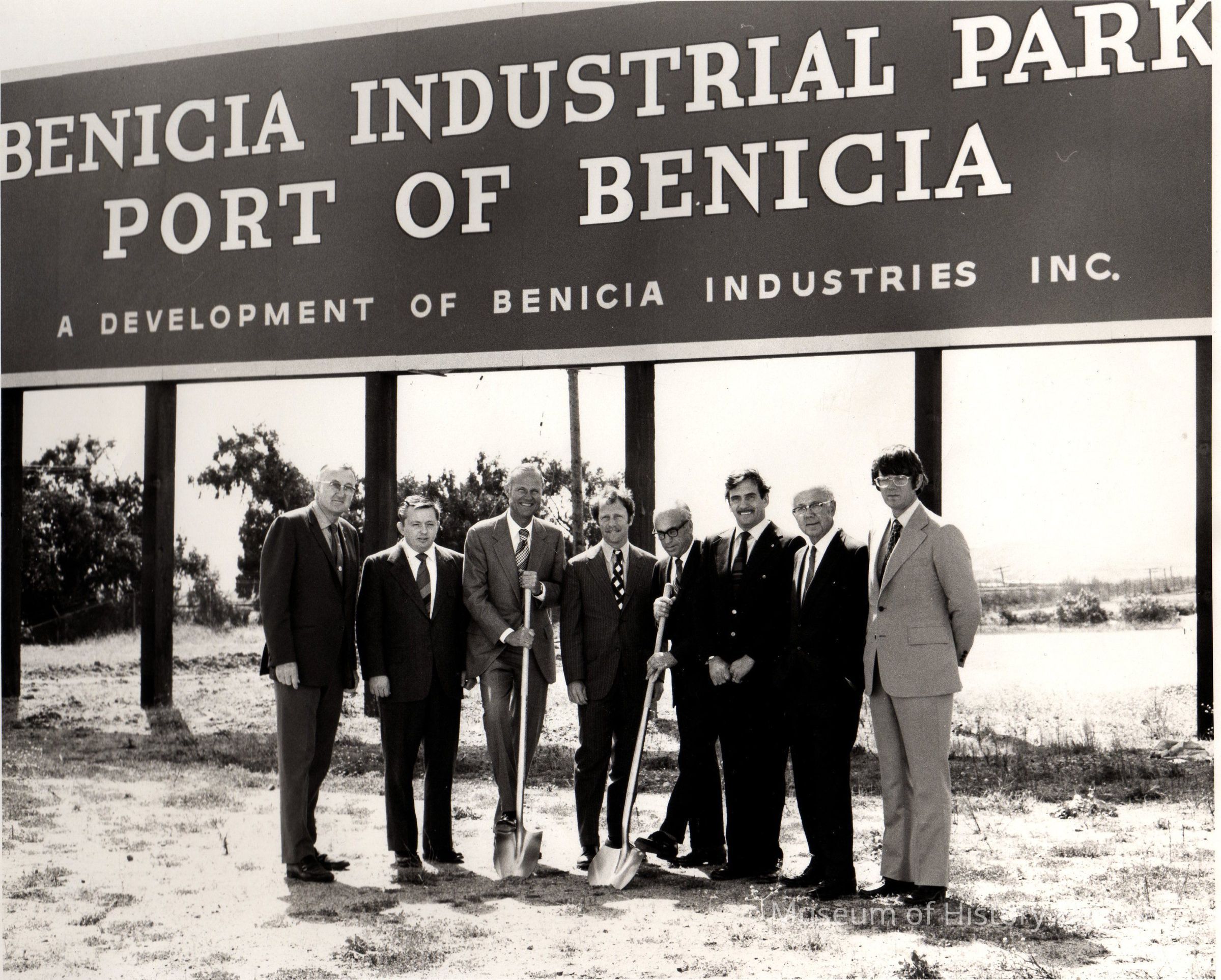 Group of eight men standing under Benicia Industrial Park sign. Two men have shovels. B/W photo.