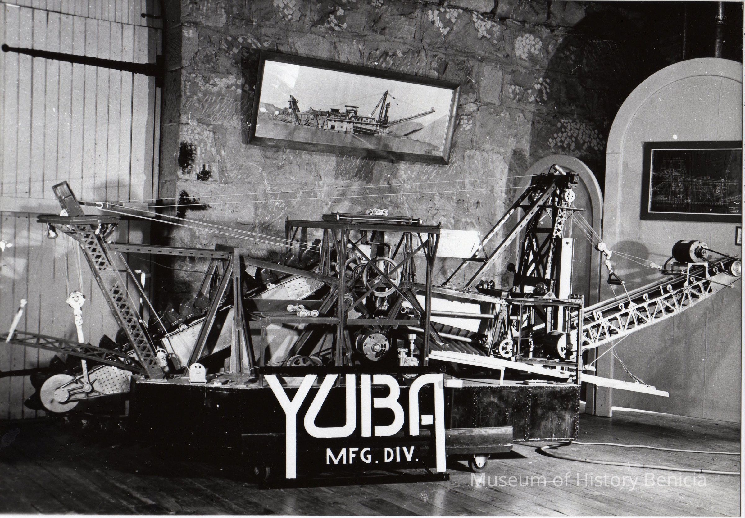 B/W photo of Yuba dredge model, 1913. Working model of gold dredge built in 1913 by Yuba Mfg. Co. at Marysville. Displayed at Panama Pacific Exhibition in San Francisco, 1915.Collection