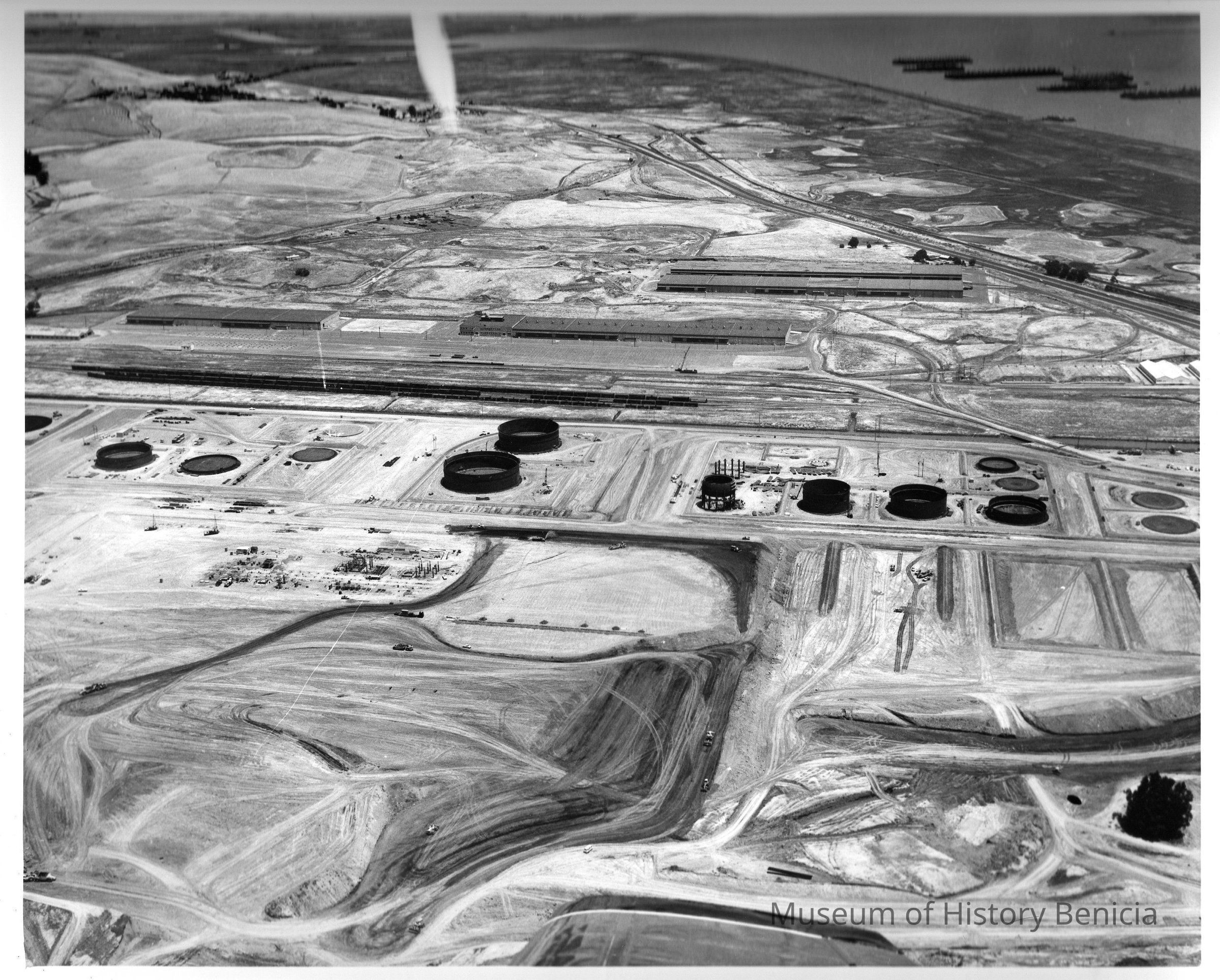 looking north-northeast: Reserve Fleet in upper right corner, 680 freeway slightly lower, upper right partially completed storage tanks and other equipment in center, graded pads and access roads in lower portion; some construction equipment is visible, warehouses (later Ace Hardware) in upper center. (an airplane wing is visible at the bottom of the photo)Collection