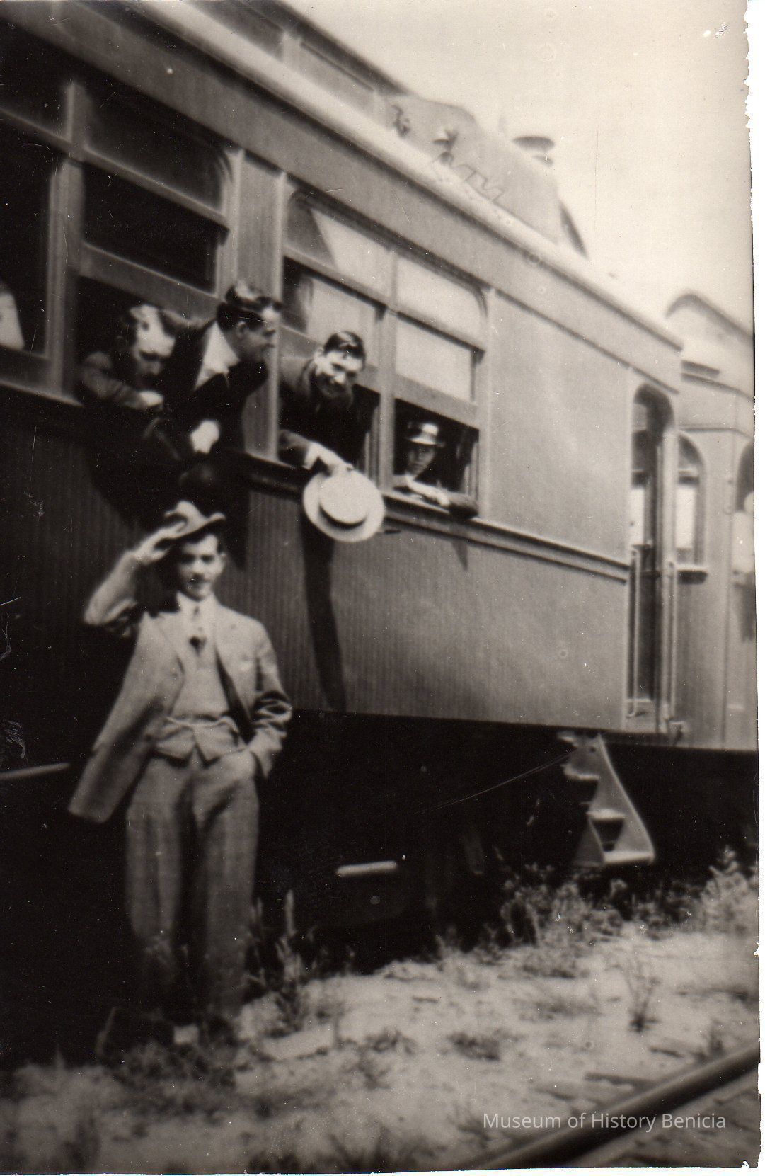 B/W Photograph: Man standing by a train passenger car, some men hanging out the windows.