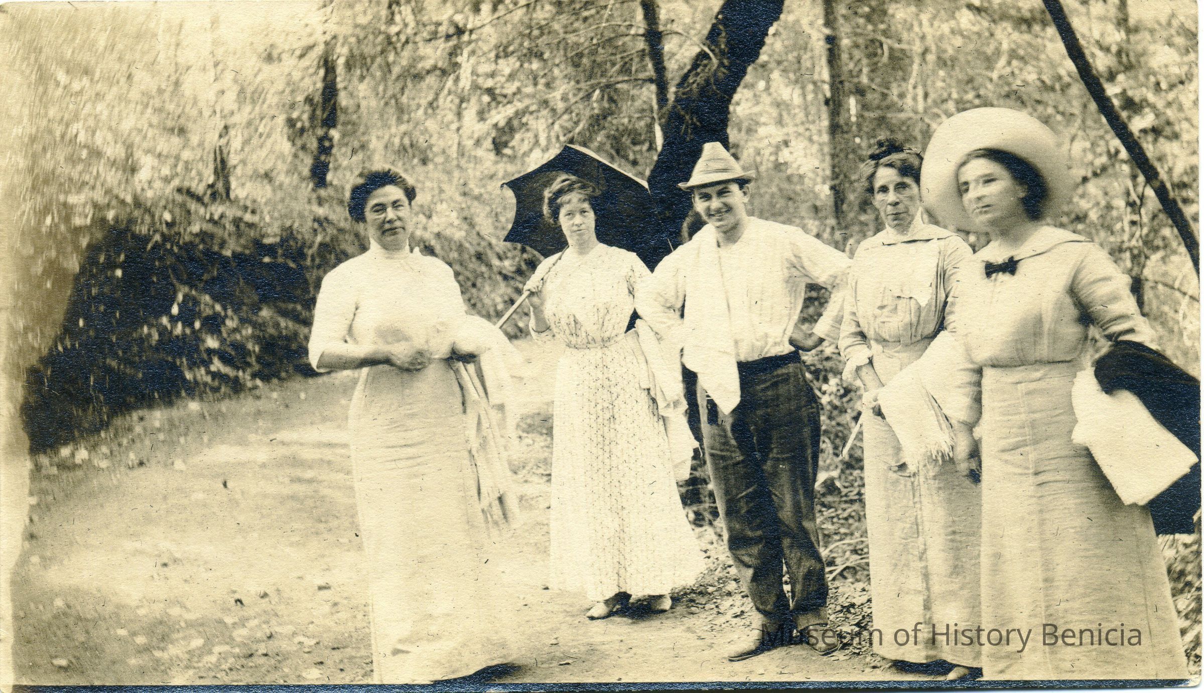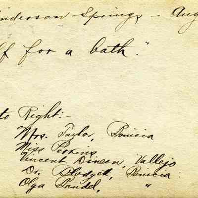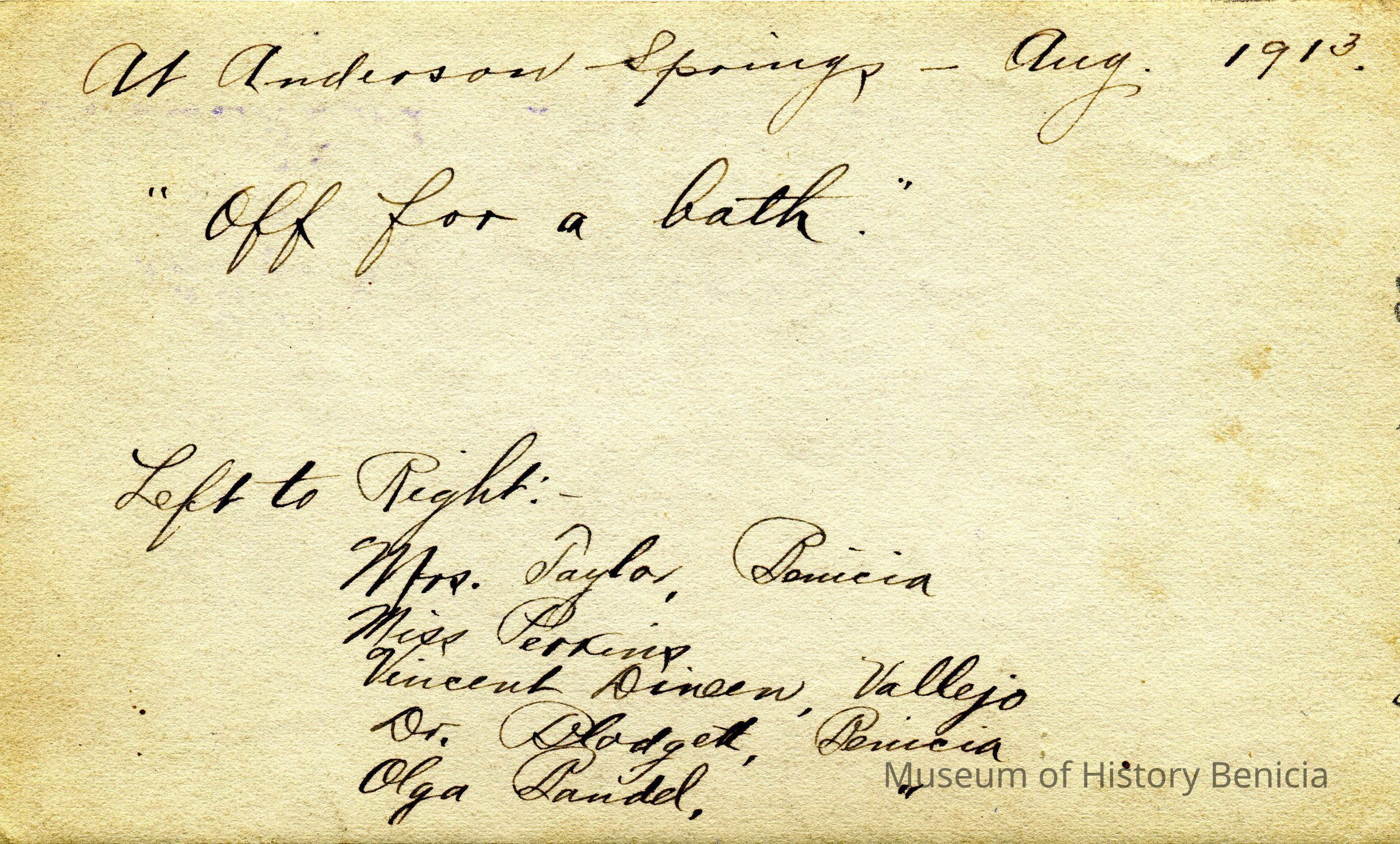 This is a photo of people at Anderson's Springs in August of 1913. The title is "Off for a Bath". The people are identified as: