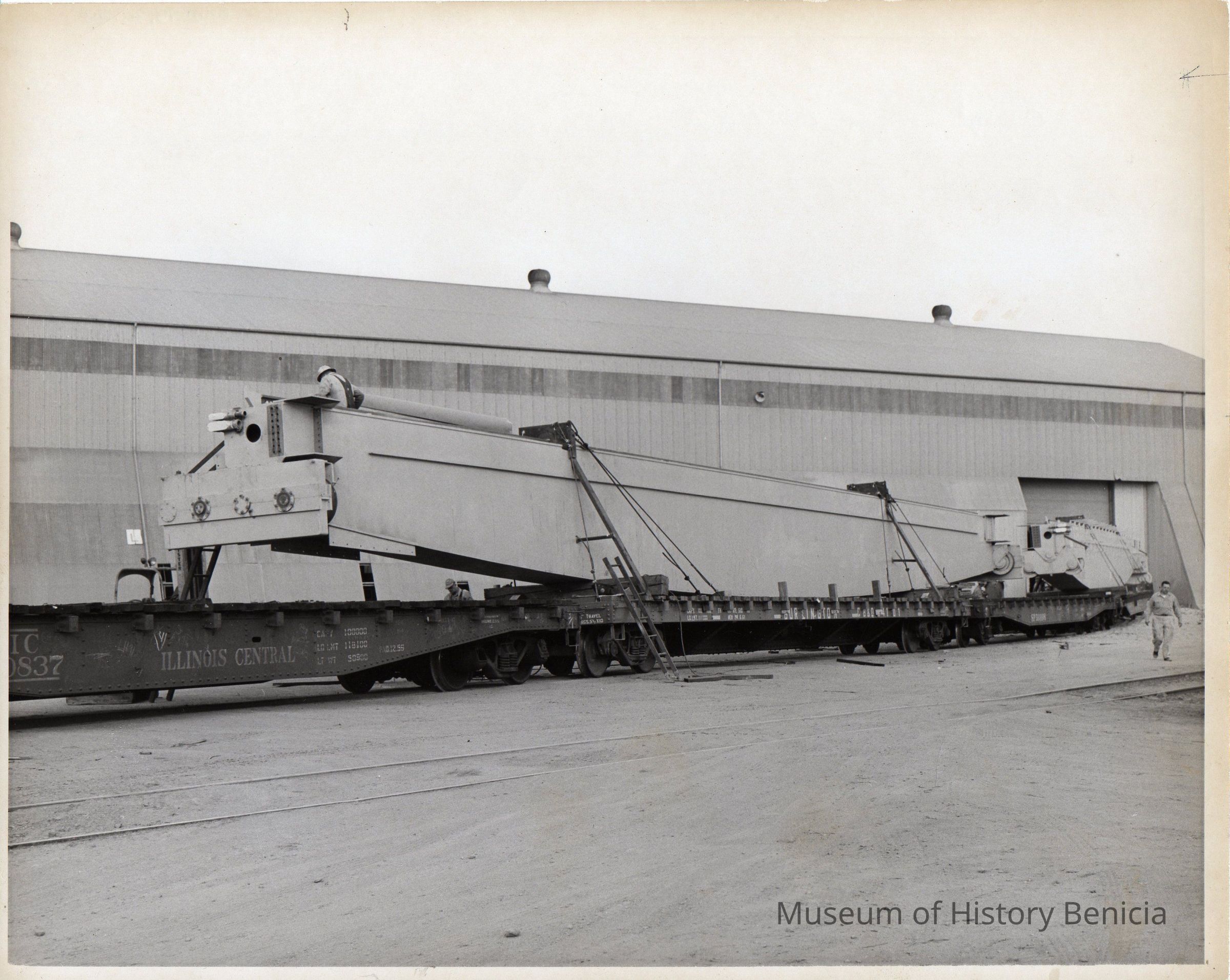 Black and white photo of a girder for a Gantry crane loaded for shipment.