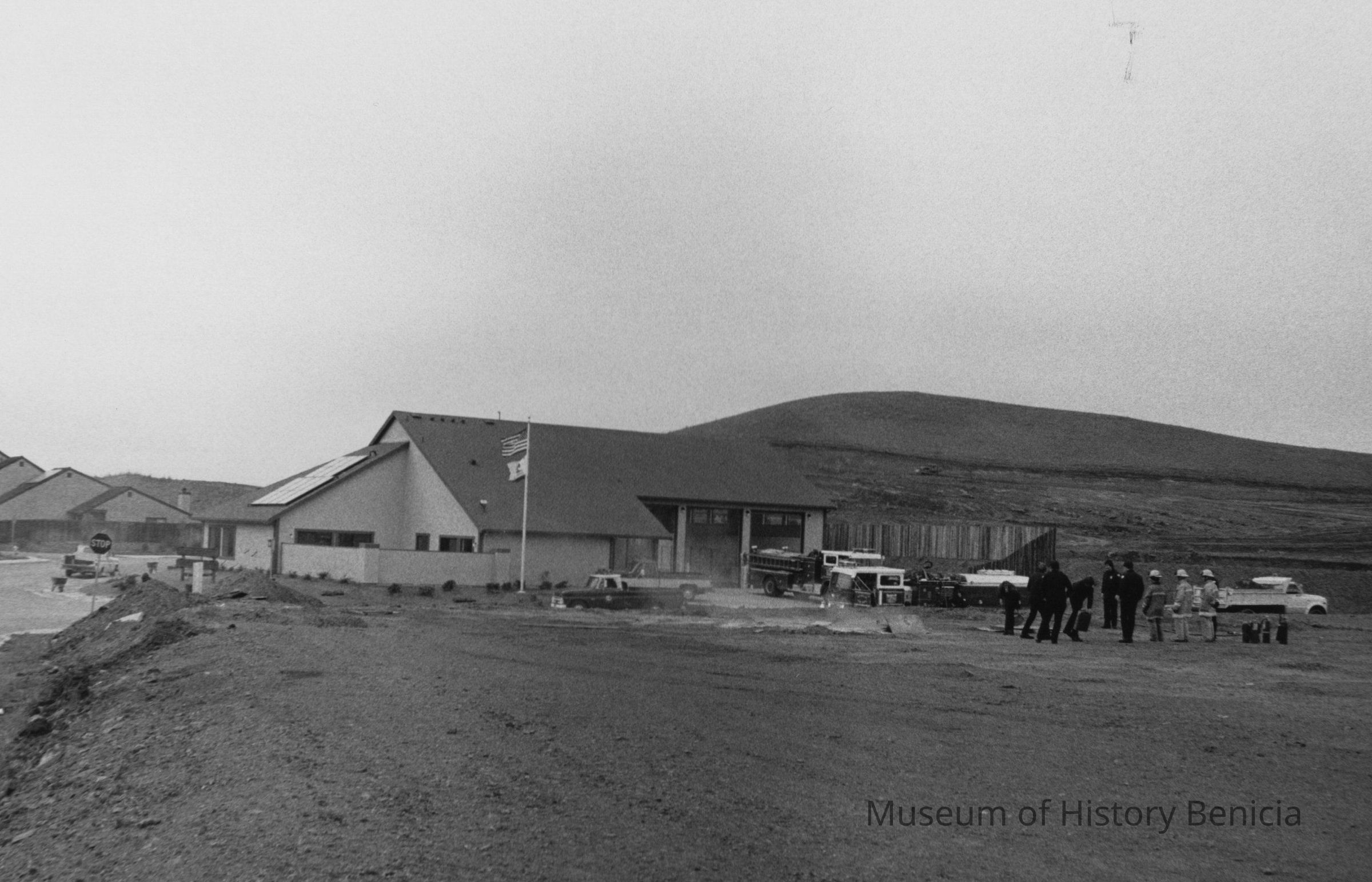 B/W photograph of West End Hose Company firehouse at Solano Drive and Hastings Drive. Label on back reads: "Benicia firemen engage in fire drills adjacent to the new solar fire station in the Southampton subdivision."Collection
