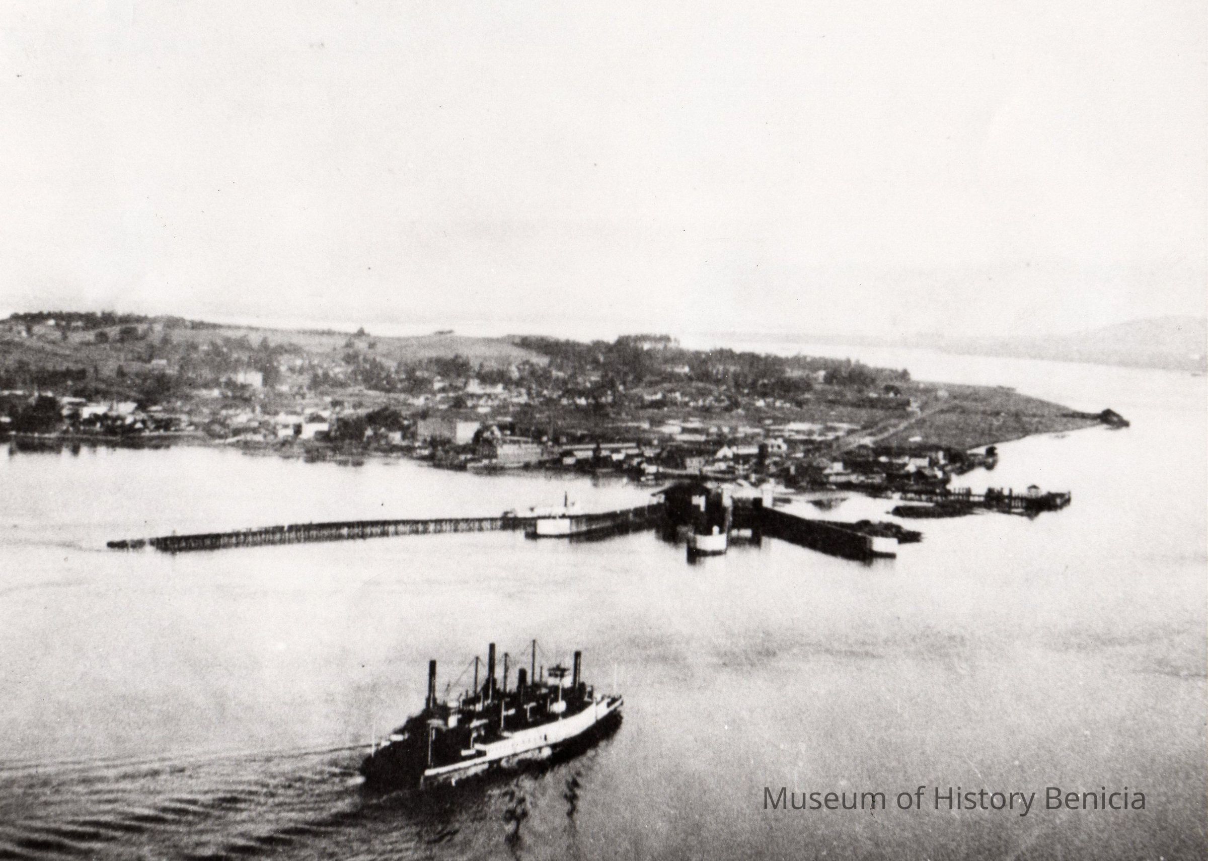 B/W photograph: View of Benicia as seen from the Contra Costa hills. Ferry from Port Costa approaching Benicia.