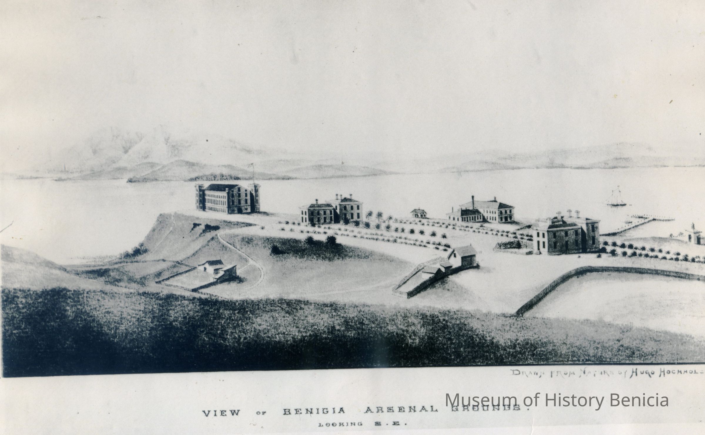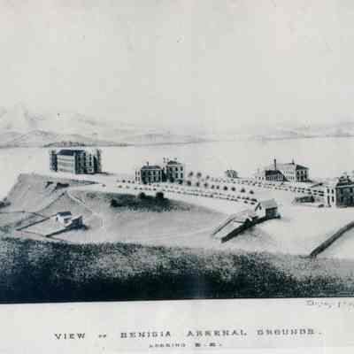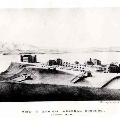 B/W Photograph of an early lithograph "View of Benicia Arsenal Grounds. Looking S.E."