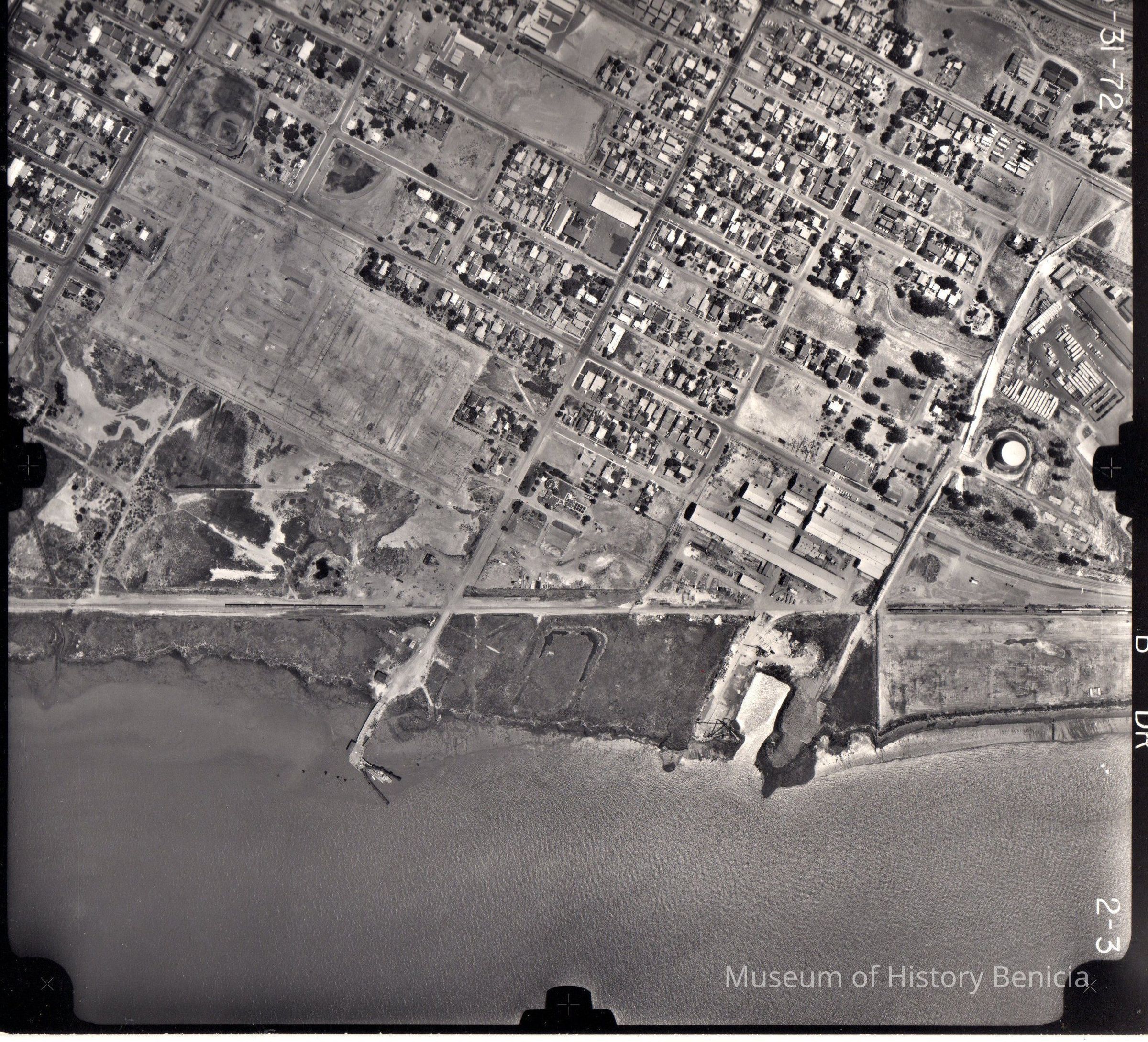 B/W Aerial view of Benicia waterfront looking east. Shows Benicia-Martinez ferry slip and Yuba Manufacturing Co. buildings and barge loading area. The layout of the yet to be constructed mobile home park is visible to the center left. Photo marked 2-3.Collection