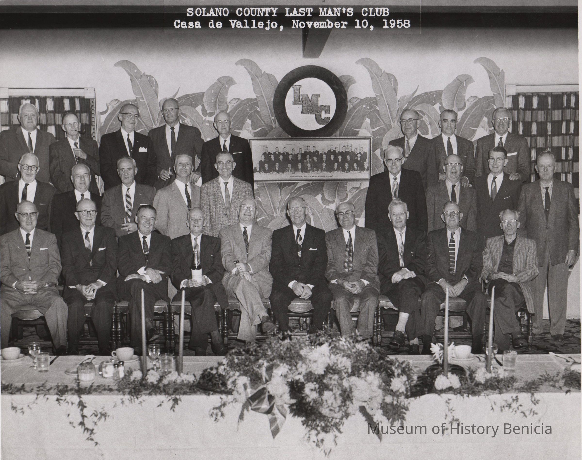 3 rows of men behind banquet table; 1937 photo of the group behind. "Solano County Last Man's Club/Casa de Vallejo, November 10, 1958" top center B/W photoCollection