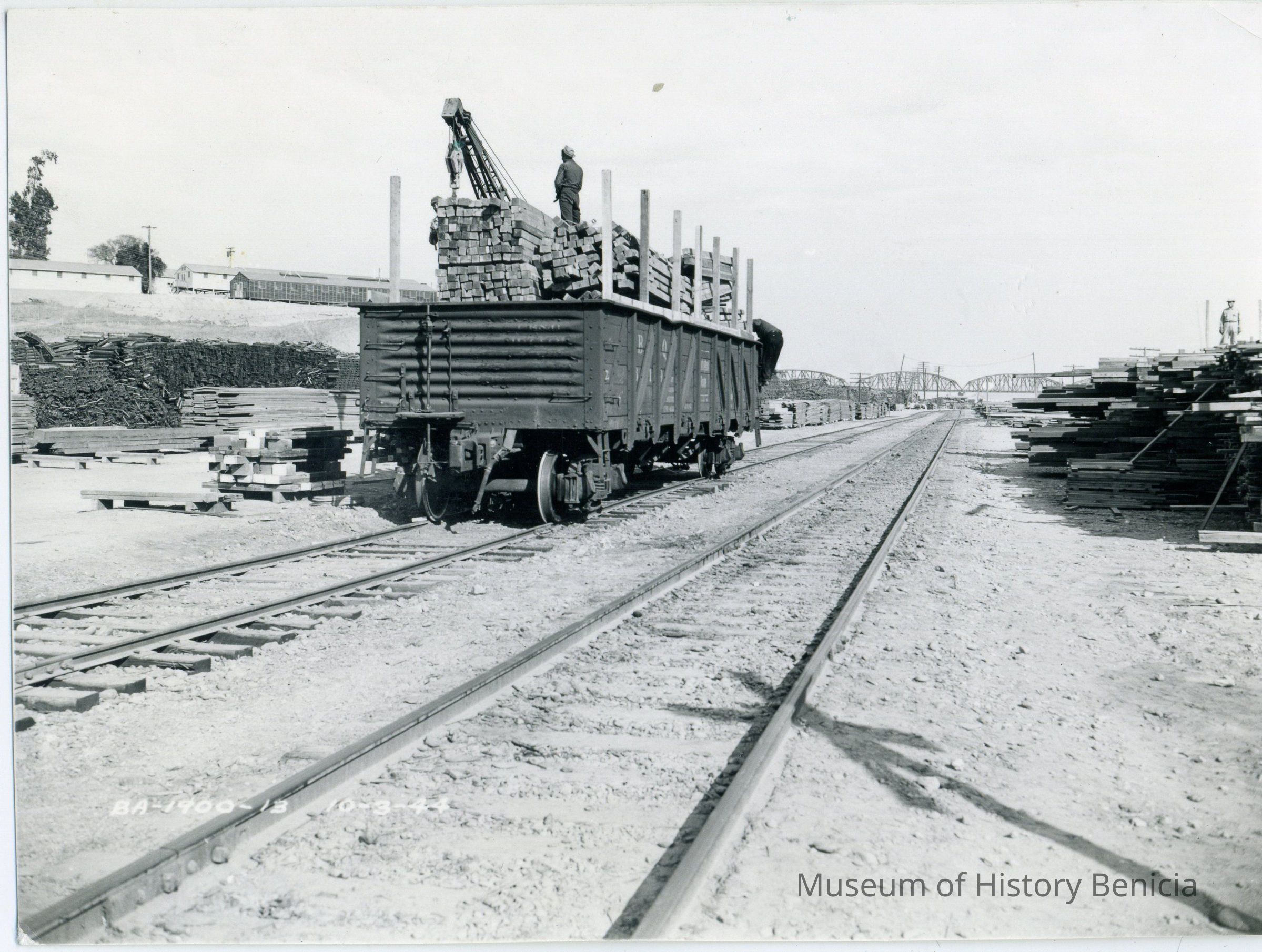 These are photos of the Benicia Arsenal at the time of WWII. They are copies of official Army photographs with the Benicia Arsenal number and date on most of them. This photo shows a rail car being loaded with lumber.Collection