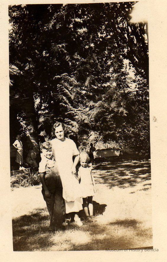 B/W photograph shows a woman standing with two children; in the background two other women are standing near a building and it seems there is a picnic table covered with a table cloth and perhaps food is set out for lunch; a man may be sitting at the table; location is unknownCollection