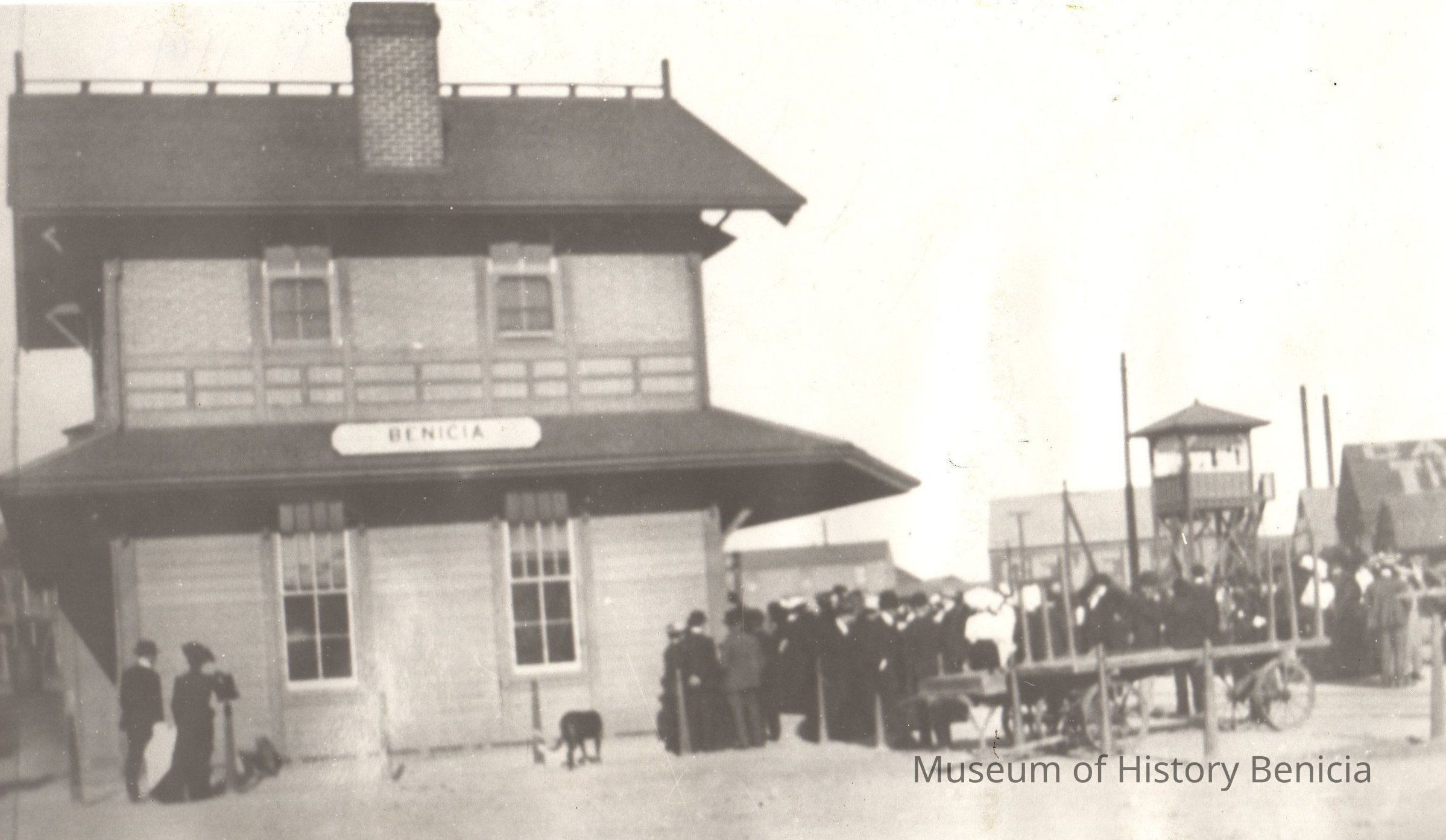 B/W Photograph: shows a large crowd of people outside the Benicia Train Depot.
